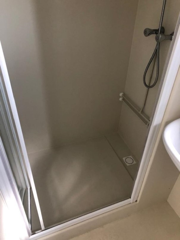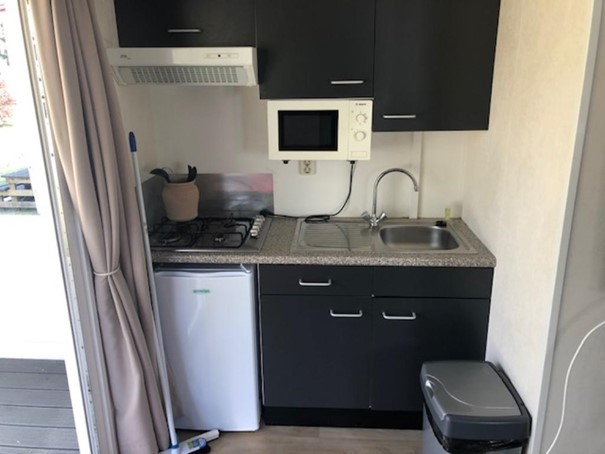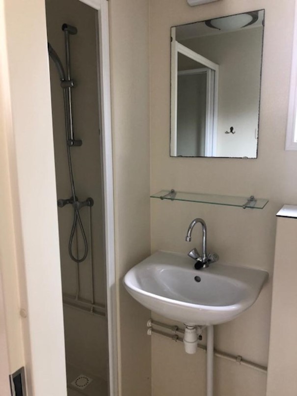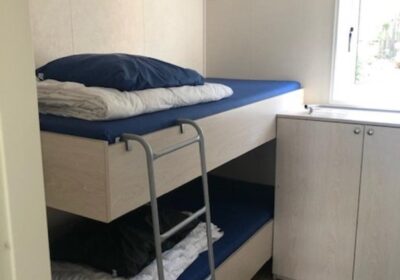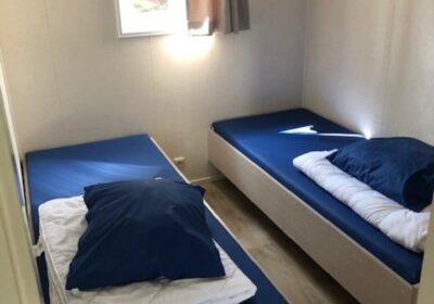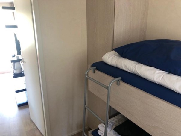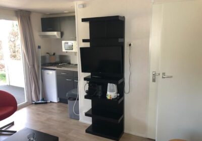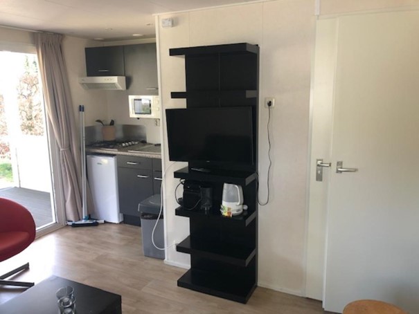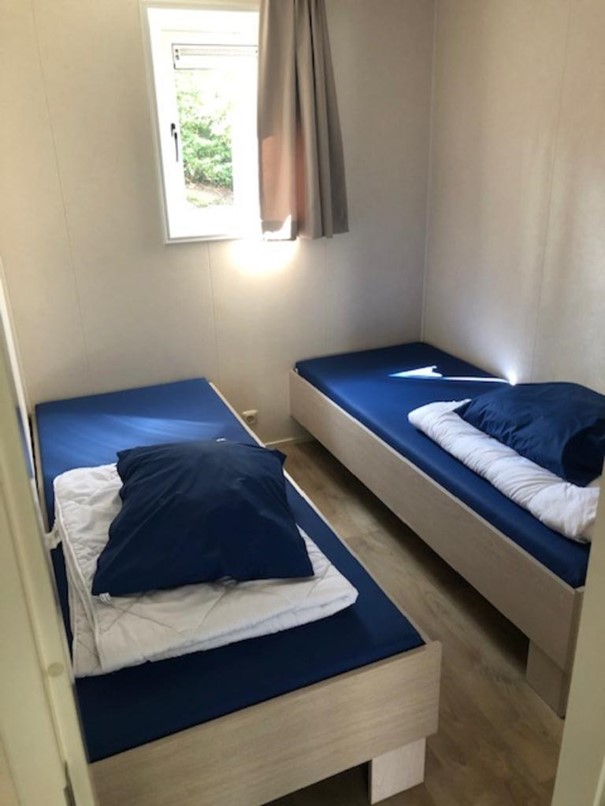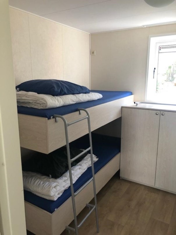 Het chalet is voorzien van een living met keuken en verwarming (Pelgrim Bambino 70T). De keuken bestaat uit een recht keukenblok met een 4-pits kookplaat, koelkast en afzuigkap. In het chalet zijn twee slaapkamers. In de eerste slaapkamer staan twee enkele bedden (afmeting: 0,80 x 2,00 meter) en een kast. In de tweede slaapkamer staat een stapelbed (afmeting: 0,80 x 2,00 meter) en twee kasten. Alle bedden zijn inclusief matrassen. De badkamer bestaat uit een wastafel met spiegel, toilet en douche. Het chalet is voorzien van overgordijnen en de ramen zijn voorzien van een draai/kiep systeem. In het chalet zijn stopcontacten en verlichting aanwezig. Tevens is het voorzien van een schuifpui naar buiten met een veranda.