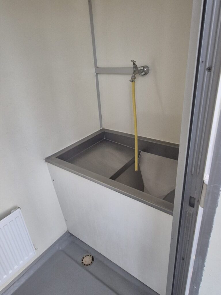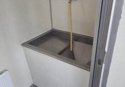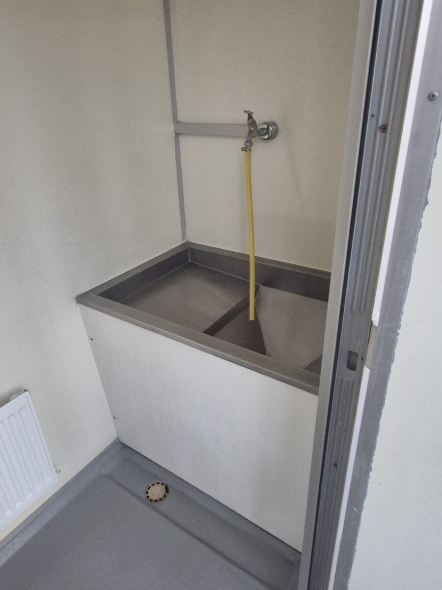 Een gebruikte maar in goede staat verkerende RvS chemische uitstortbak . Deze inbouw uitstortbak chemische is compleet met de voorplaat (trespa) voor de afwerking . Prijs 295,-