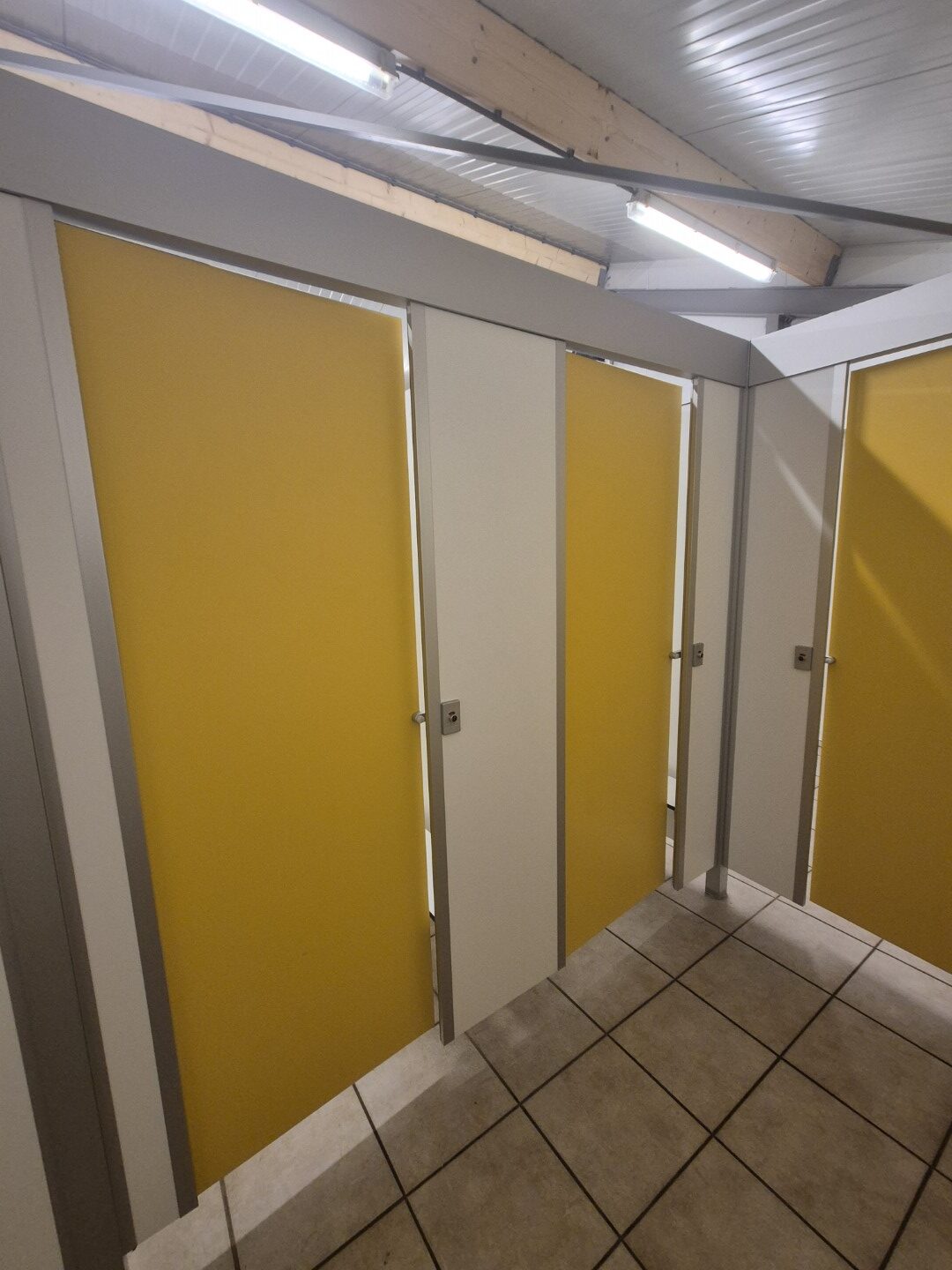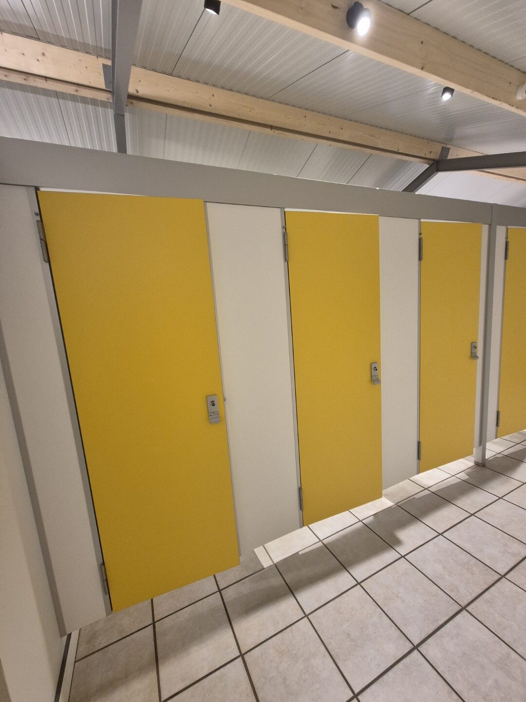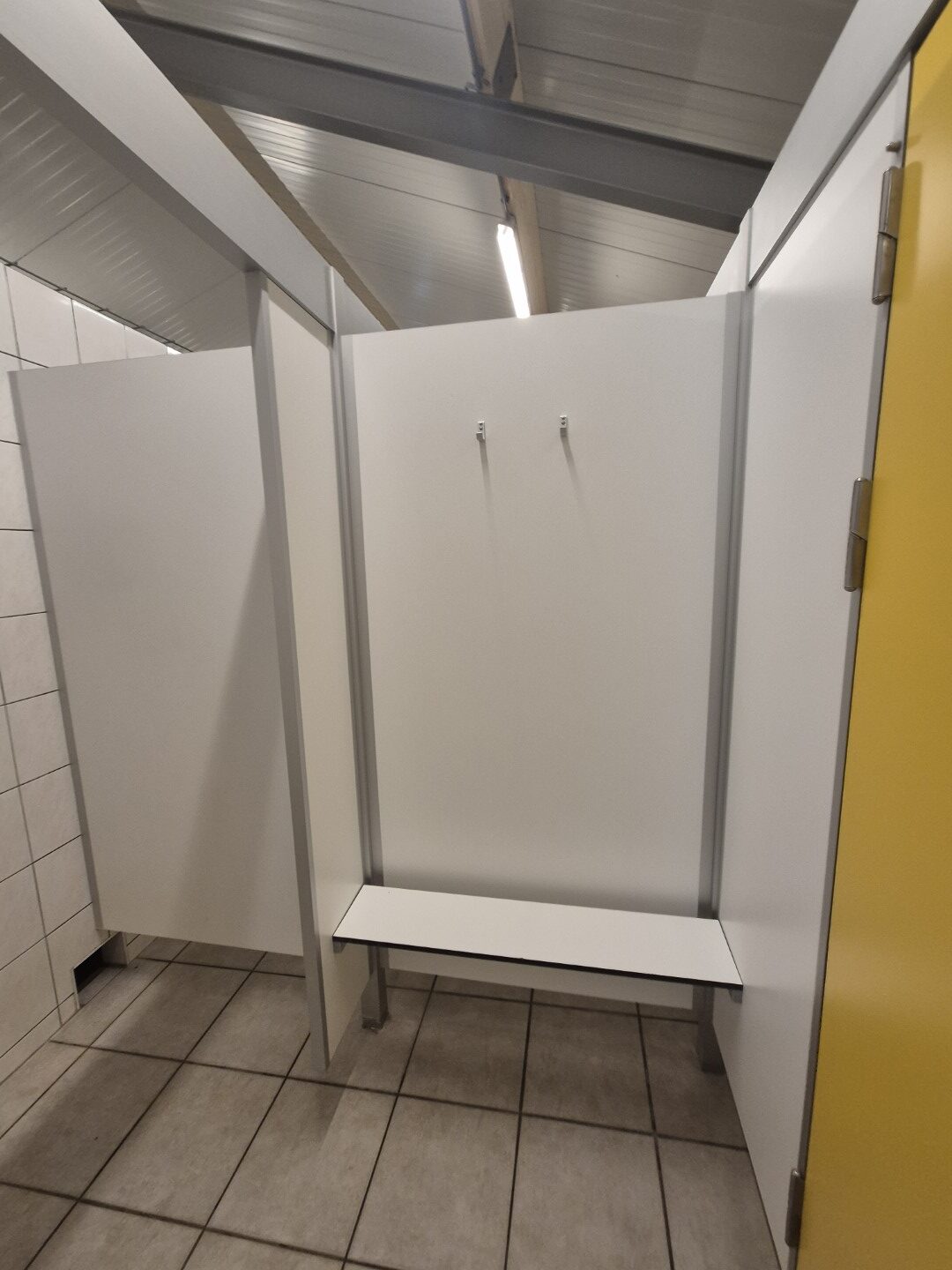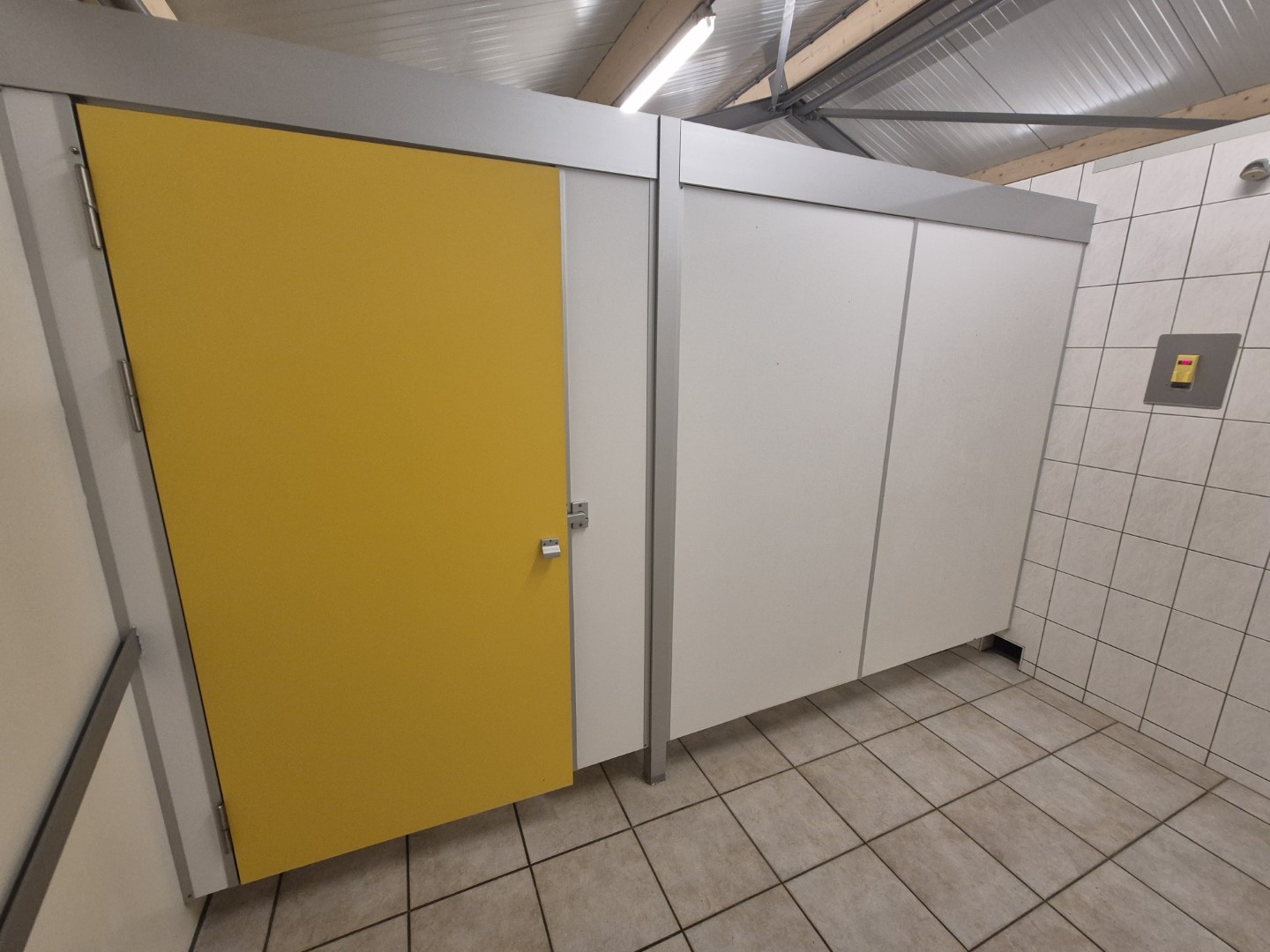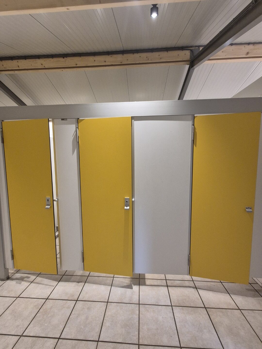 Partij is geheel van topkwaliteit trespa/Hpl (volkern deuren en tussenwanden) met RvS en aluminium hang en sluitwerk.
