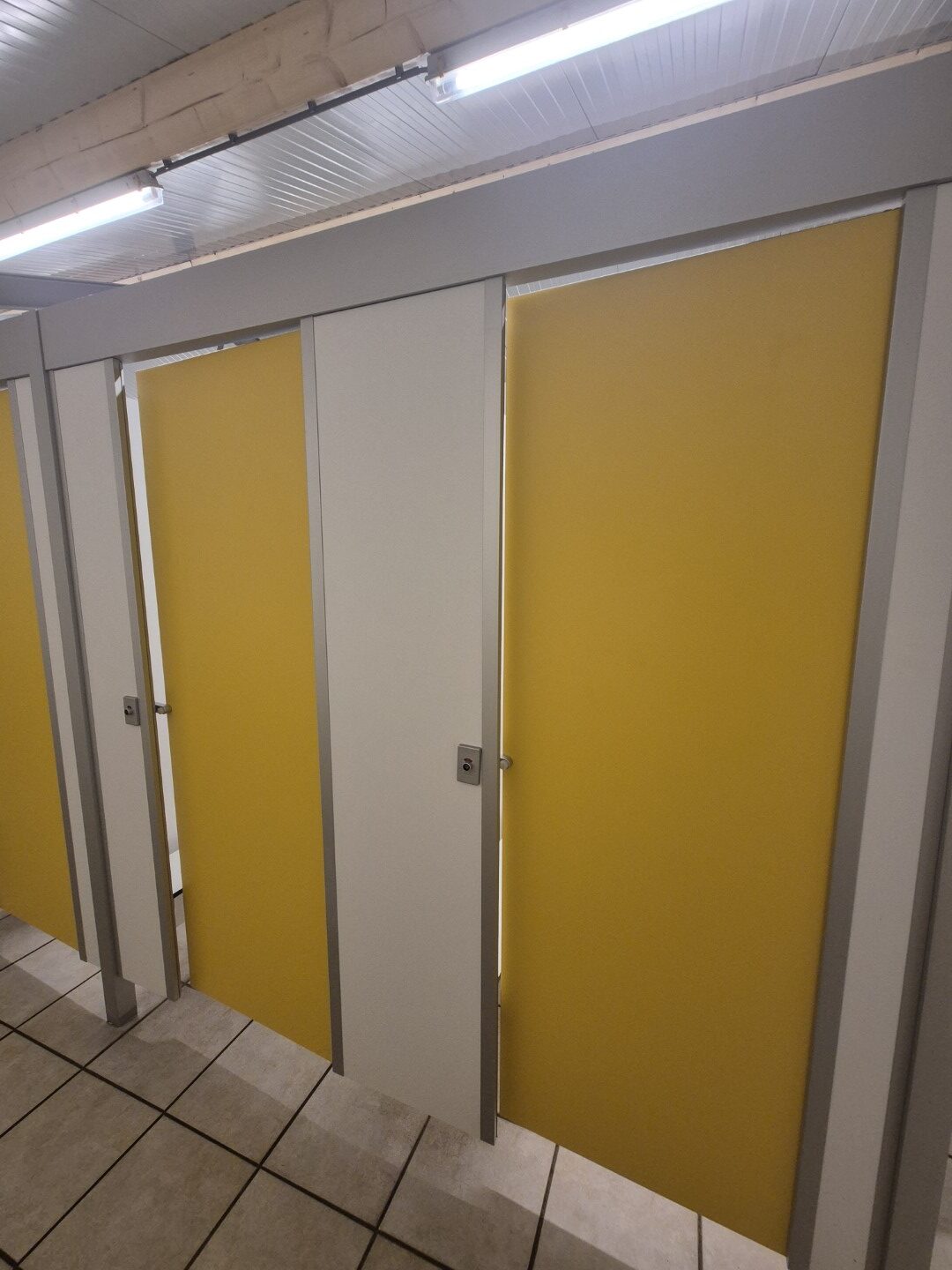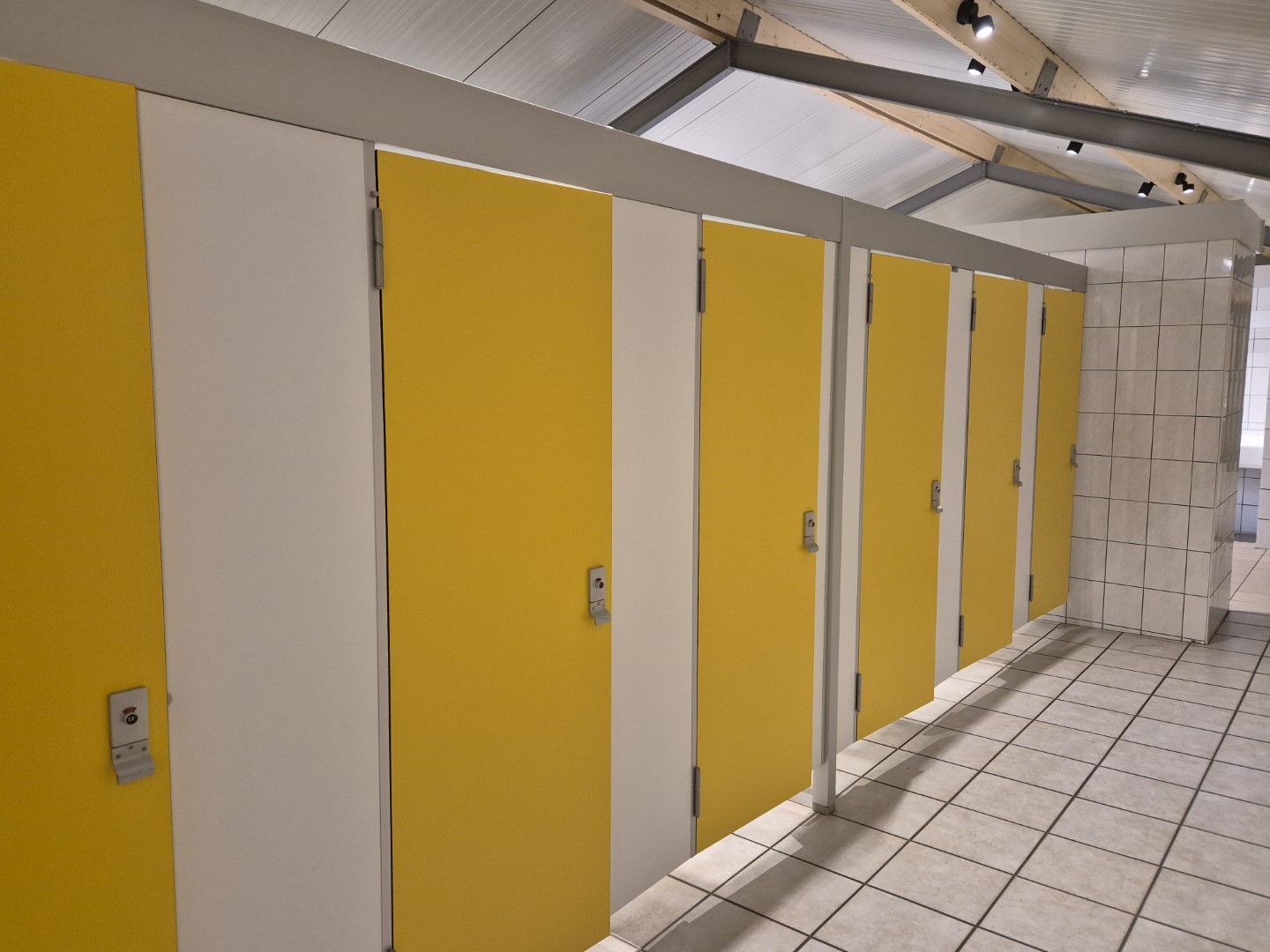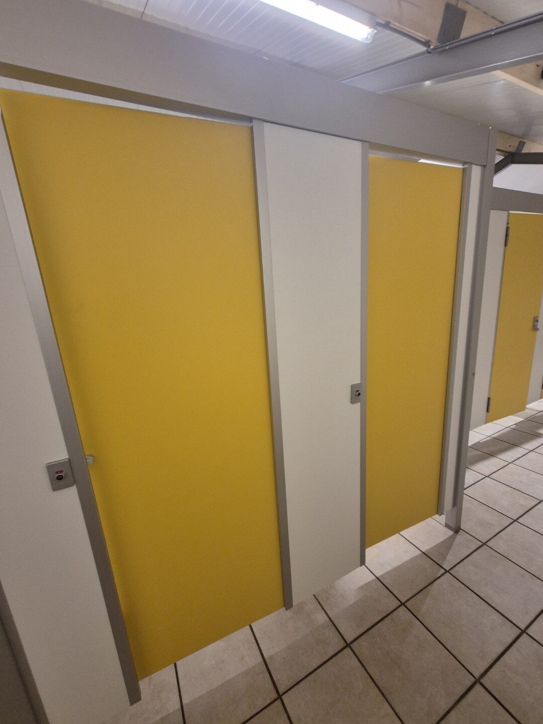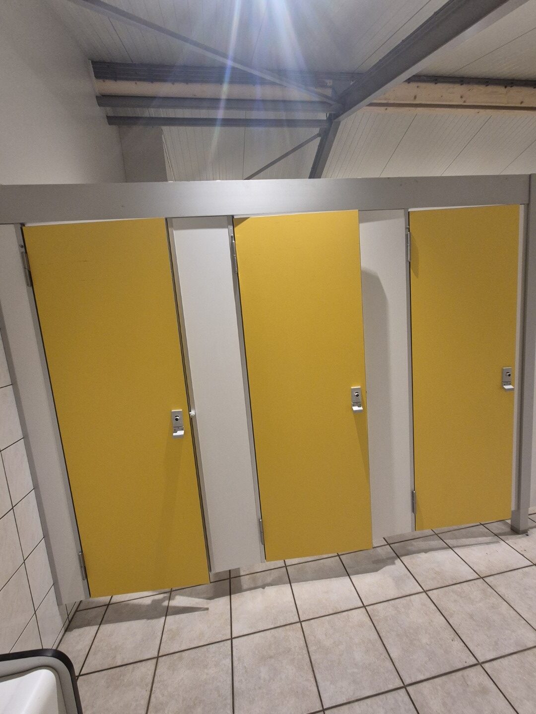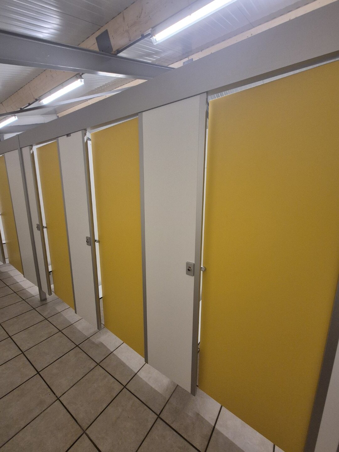 Partij is geheel van topkwaliteit trespa/Hpl (volkern deuren en tussenwanden) met RvS en aluminium hang en sluitwerk.