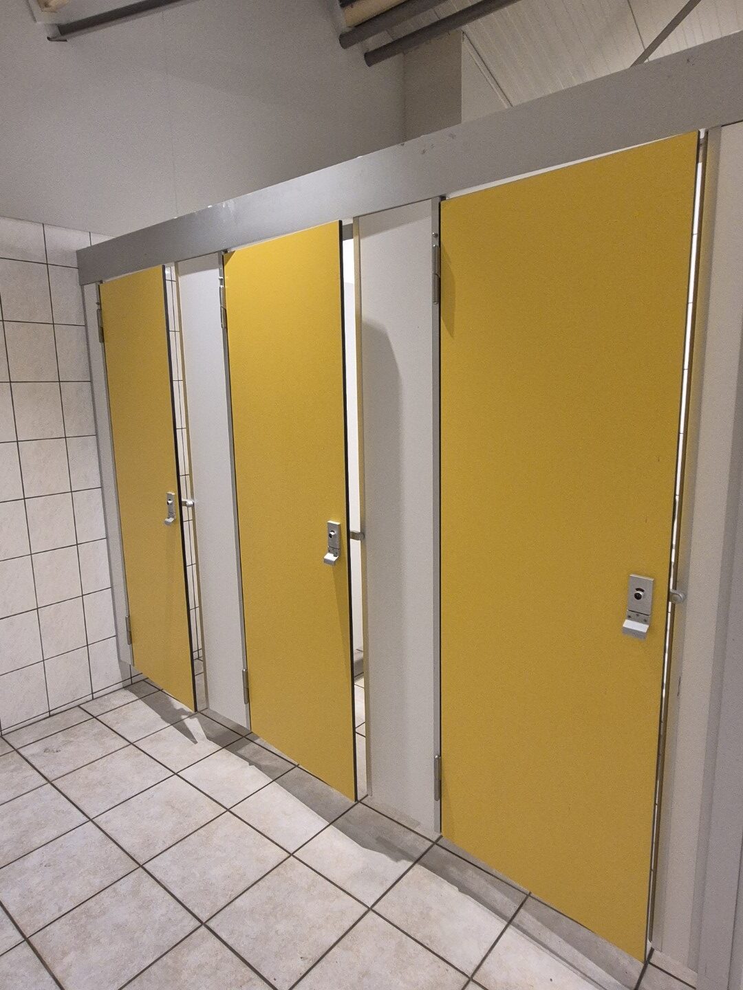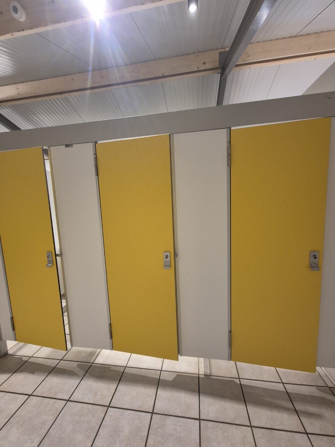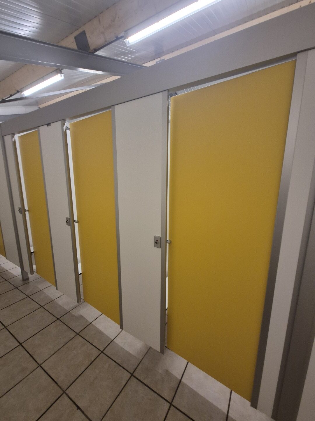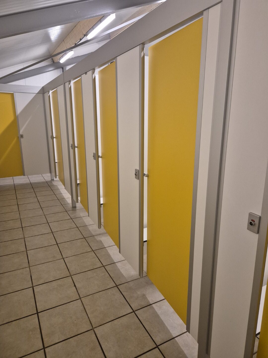 Partij is geheel van topkwaliteit trespa/Hpl (volkern deuren en tussenwanden) met RvS en aluminium hang en sluitwerk.