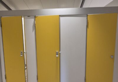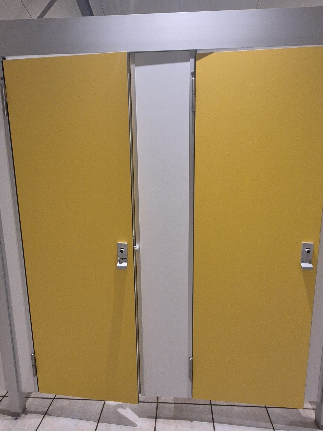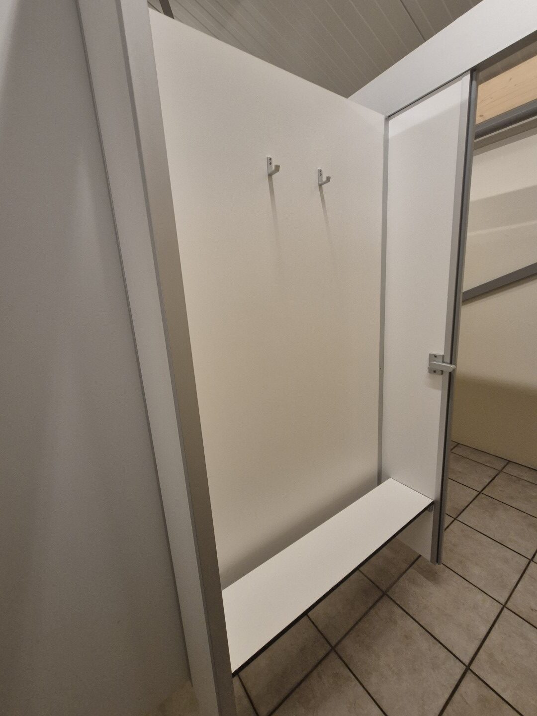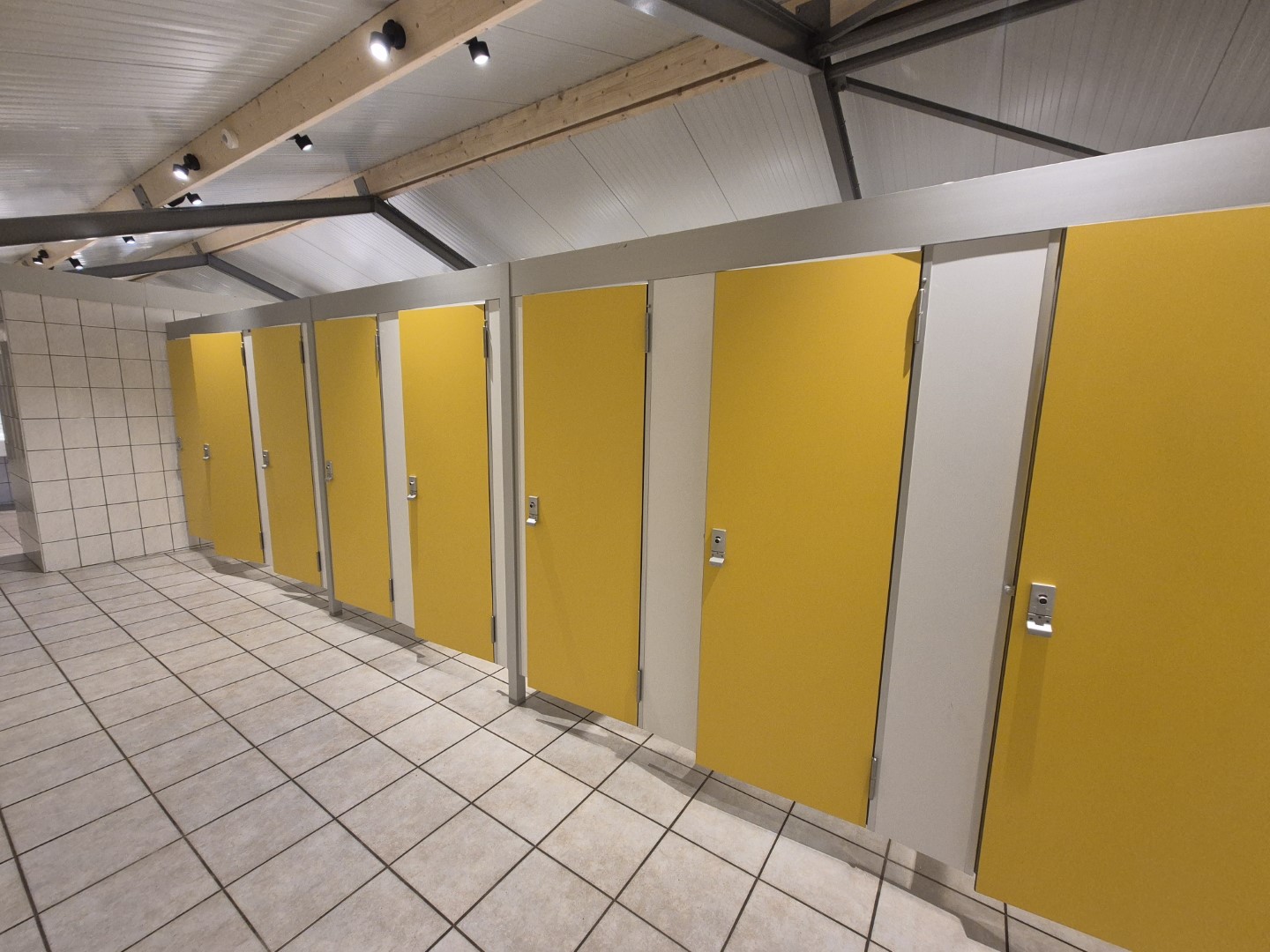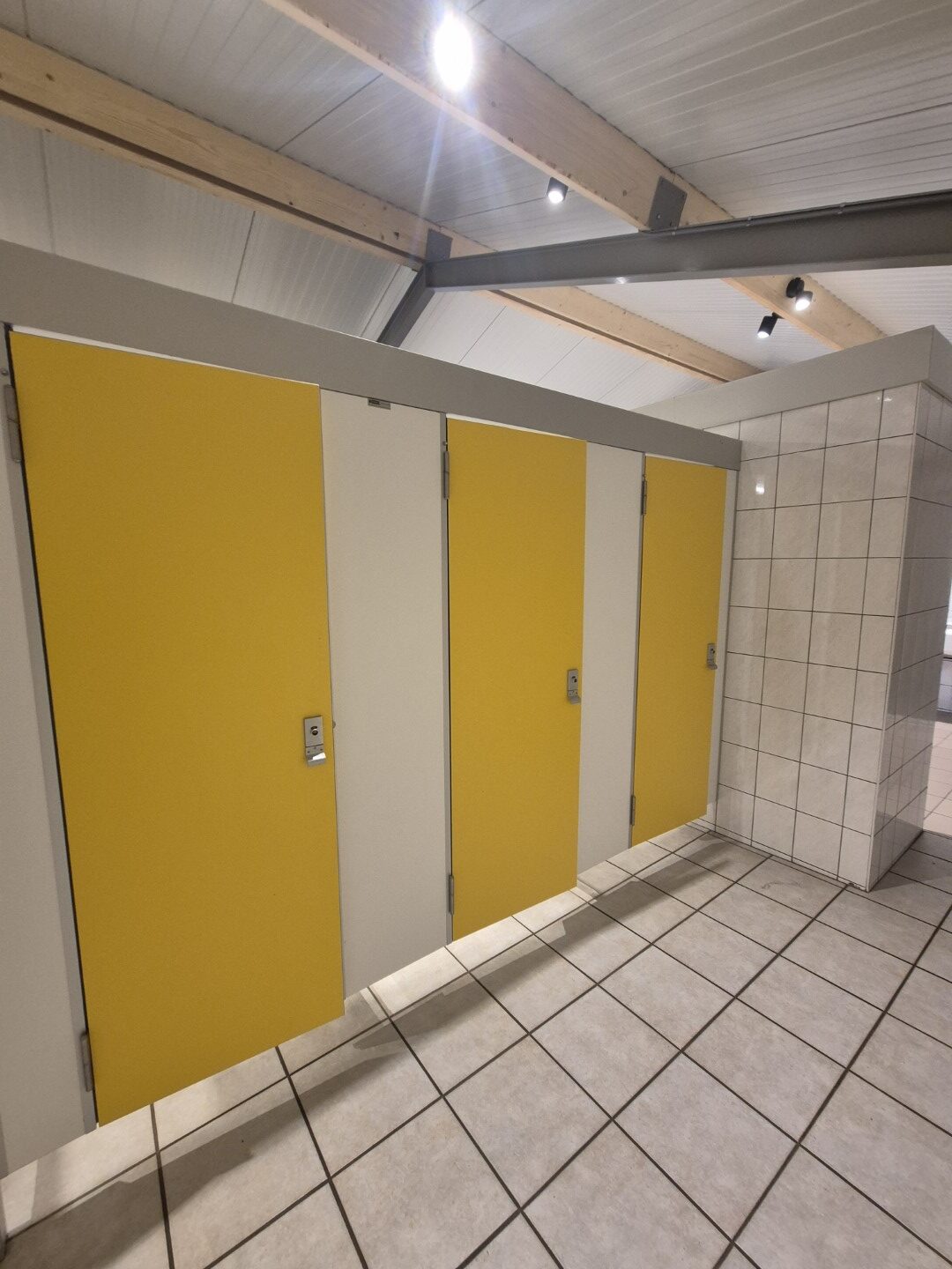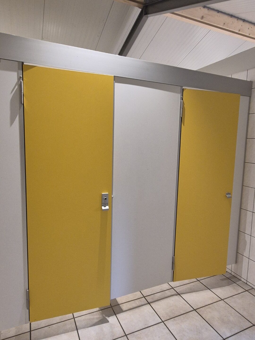 Partij is geheel van topkwaliteit trespa/Hpl (volkern deuren en tussenwanden) met RvS en aluminium hang en sluitwerk.