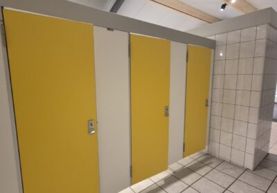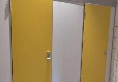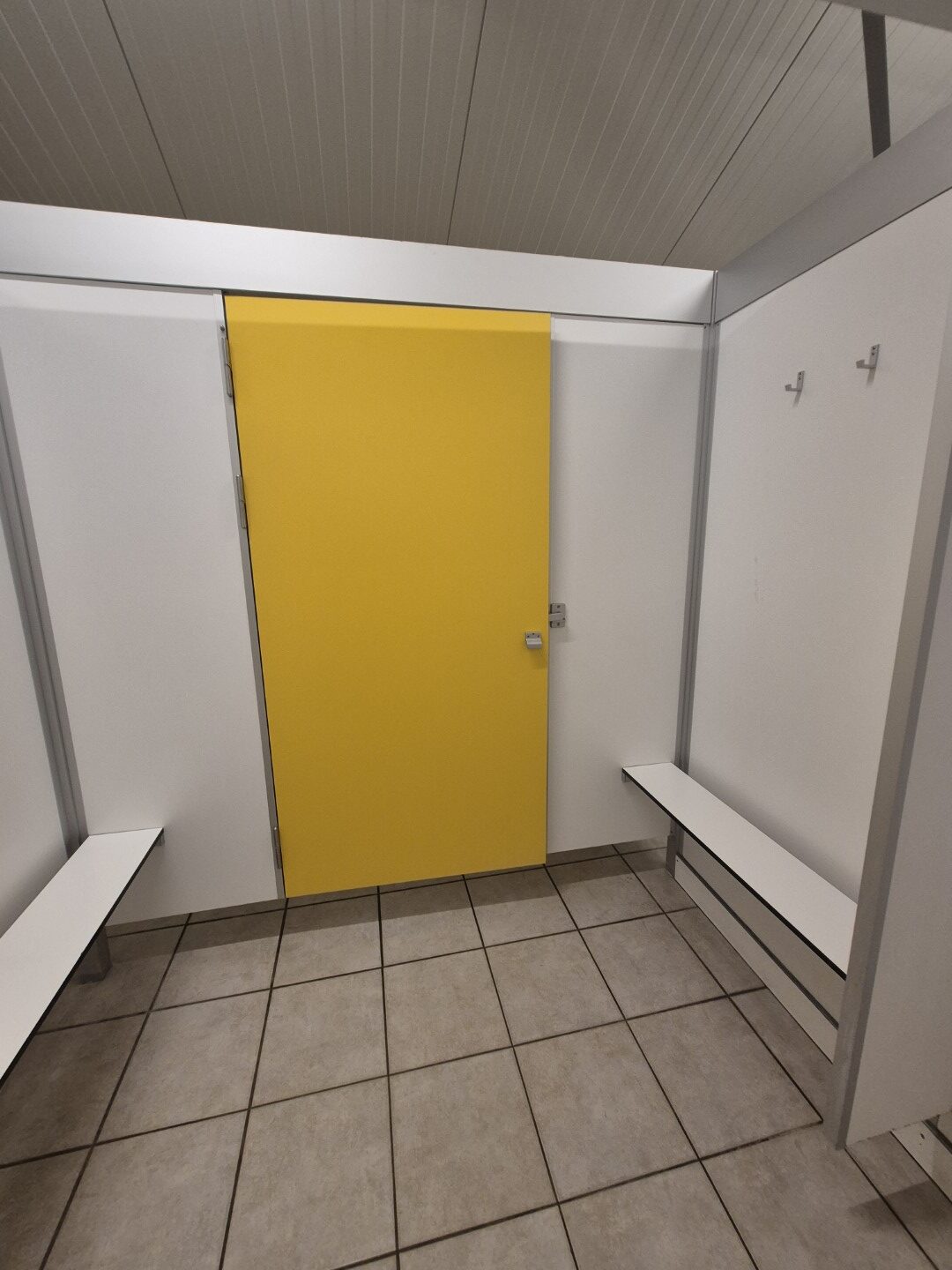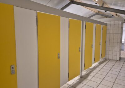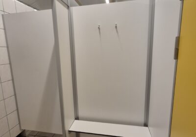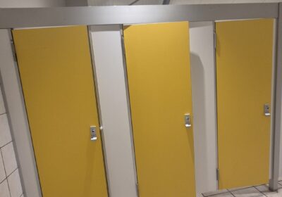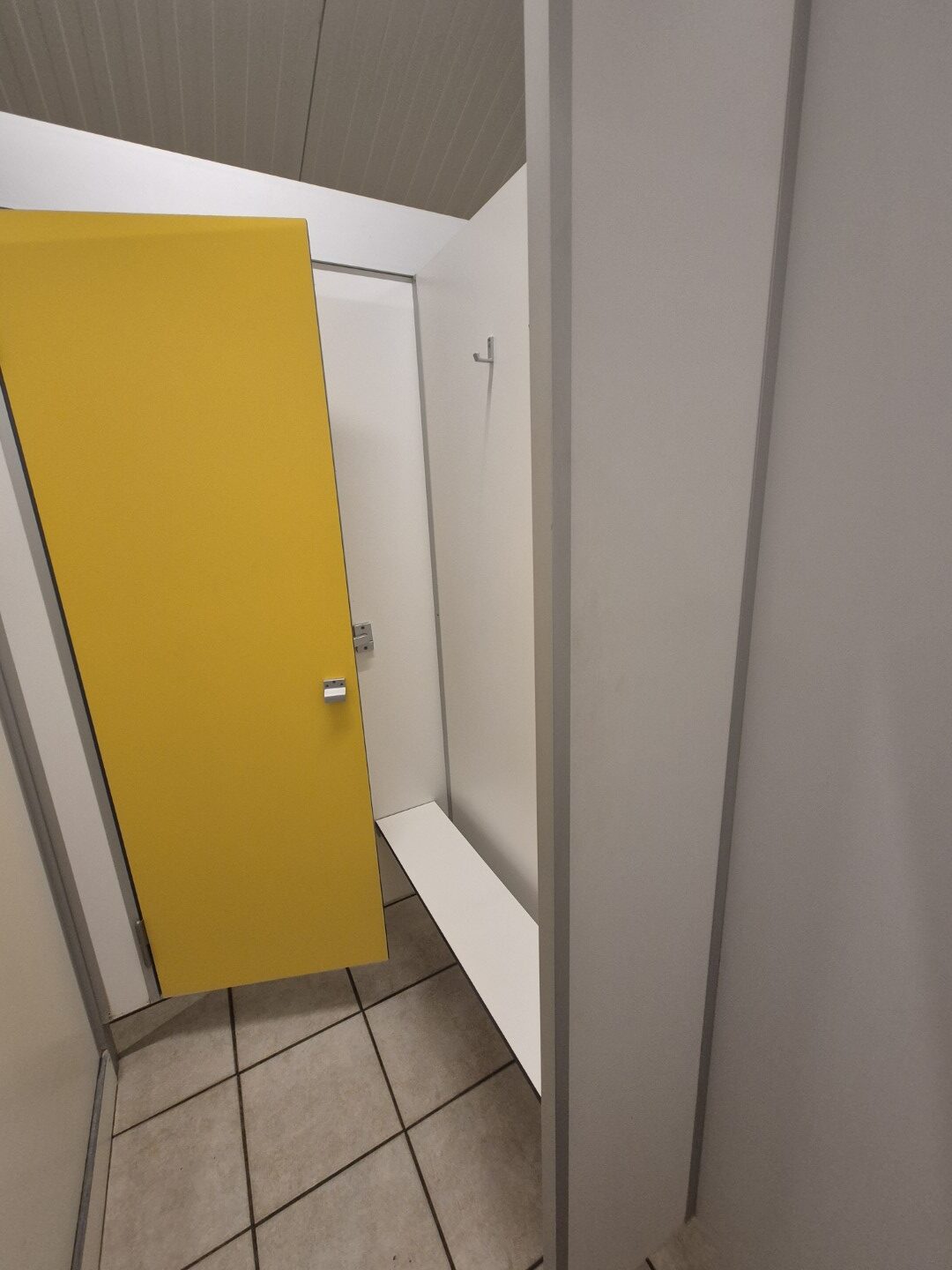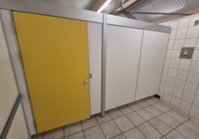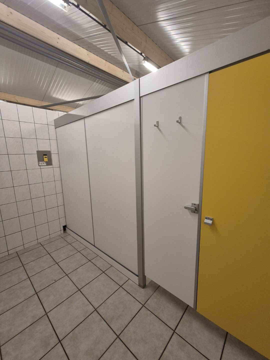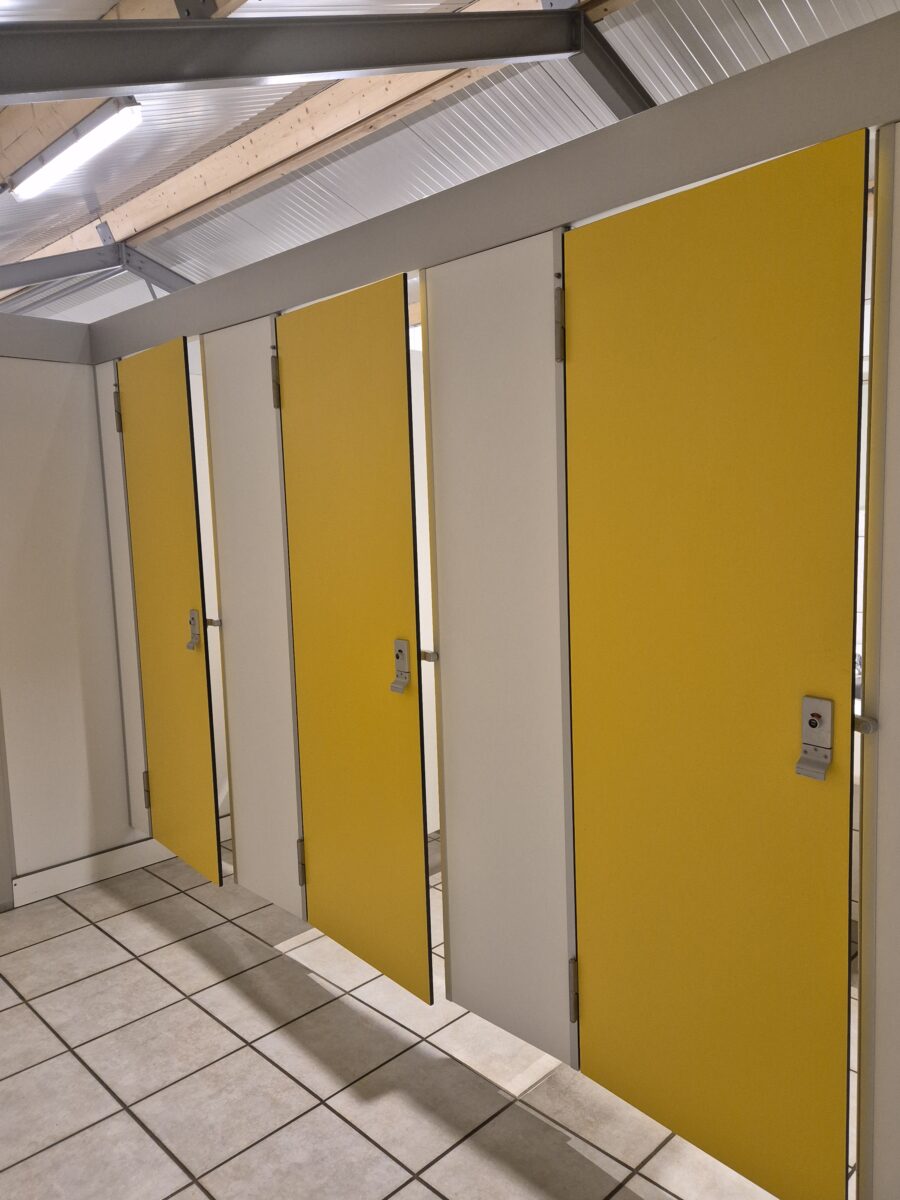 Partij is geheel van topkwaliteit trespa/Hpl (volkern deuren en tussenwanden) met RvS en aluminium hang en sluitwerk.