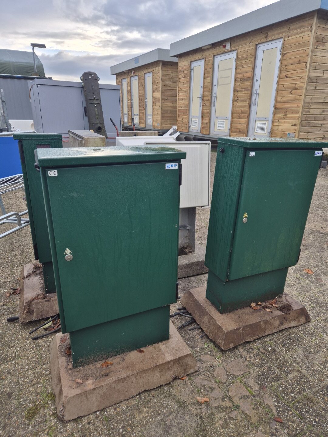 3 fraaie buiten elektra kasten in zeer sterk plaatstaal uitvoering op beton sokkel. Kasten zijn afsluitbaar en ook verder nog uit te breiden er is veel ruimte in de kasten.