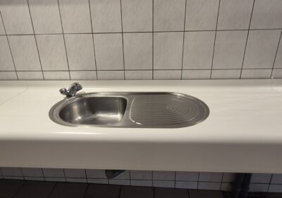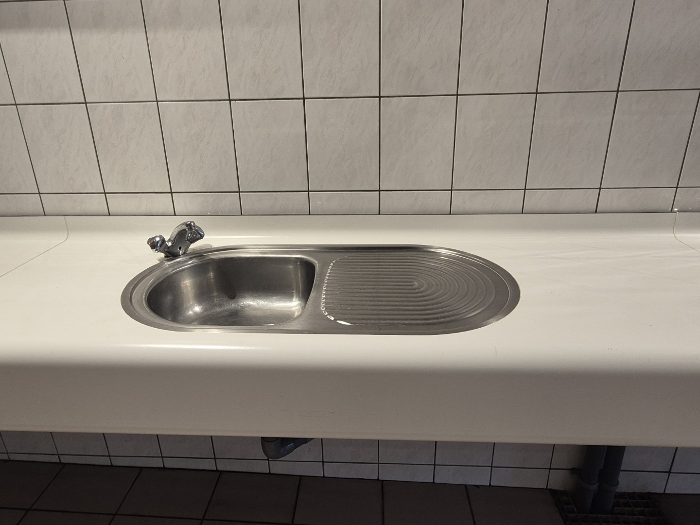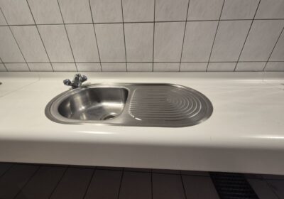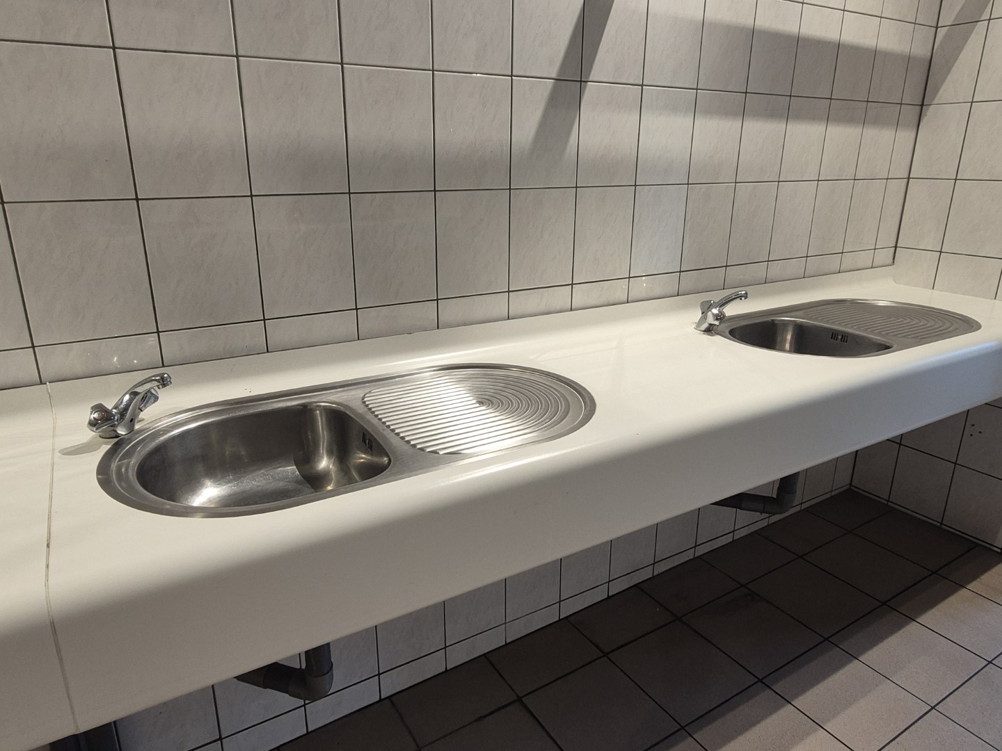 Een gebruikte en fraaie serie in goede staat verkerende afwasplaatsen met rond lopend blad . Volkern hufterproof trespa/Hpl 13 mm dik en met RvS afdruipdeel en zeer degelijke warm/koud kraan. Alle delen zijn eenvoudig koppelbaar voor een langere opstelling.