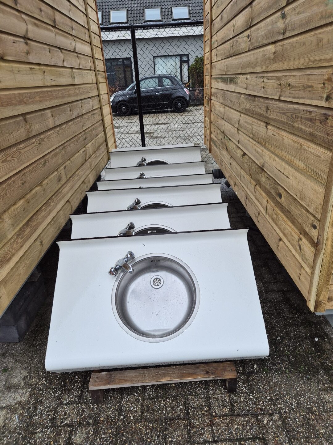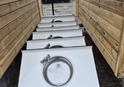 Een grote serie gebruikte nette afwasplaatsen met degelijke warm/koud kraan in fraai rond lopend volkern trespa/Hpl blad. Hufterproof en ze zijn zeer makkelijk in schoonmaken. De enkele wasplaatsen kunnen eenvoudig gekoppeld worden voor een langere opstelling en zijn dus modulair. Maatvoering frontbreedte 101 cm en diepte 60 cm . Prijs € 165,- per stuk er zijn ook 2 enkele wasplaatsen beschikbaar met een zijkant afwerking en een start/stop kraan. Prijs € 185,- Maatvoering breedte 98 cm en diepte 63 cm