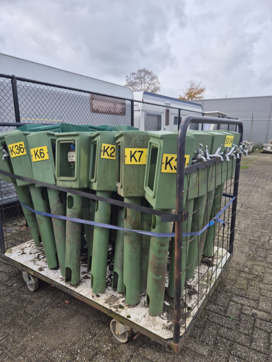 Een grote serie gebruikte aansluitpalen voor elektra of eventueel met water en cai . Makkelijke plaatsing met doorvoer van de kabel voor het aansluiten van 1 of 2 euro stekkers voor het voorzien van een stroom aansluiting. De aansluiting is dan gelijk droog en zit de aansluitstekker droog in de paal. Er kan naar wens ook een afvoer put of enkele/dubbel kraan ( aansluiting al voorbereid) bij worden geleverd voor een complete service paal. Leverbaar in licht en donker groen