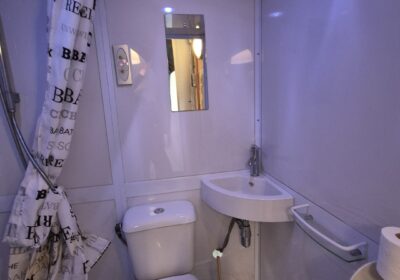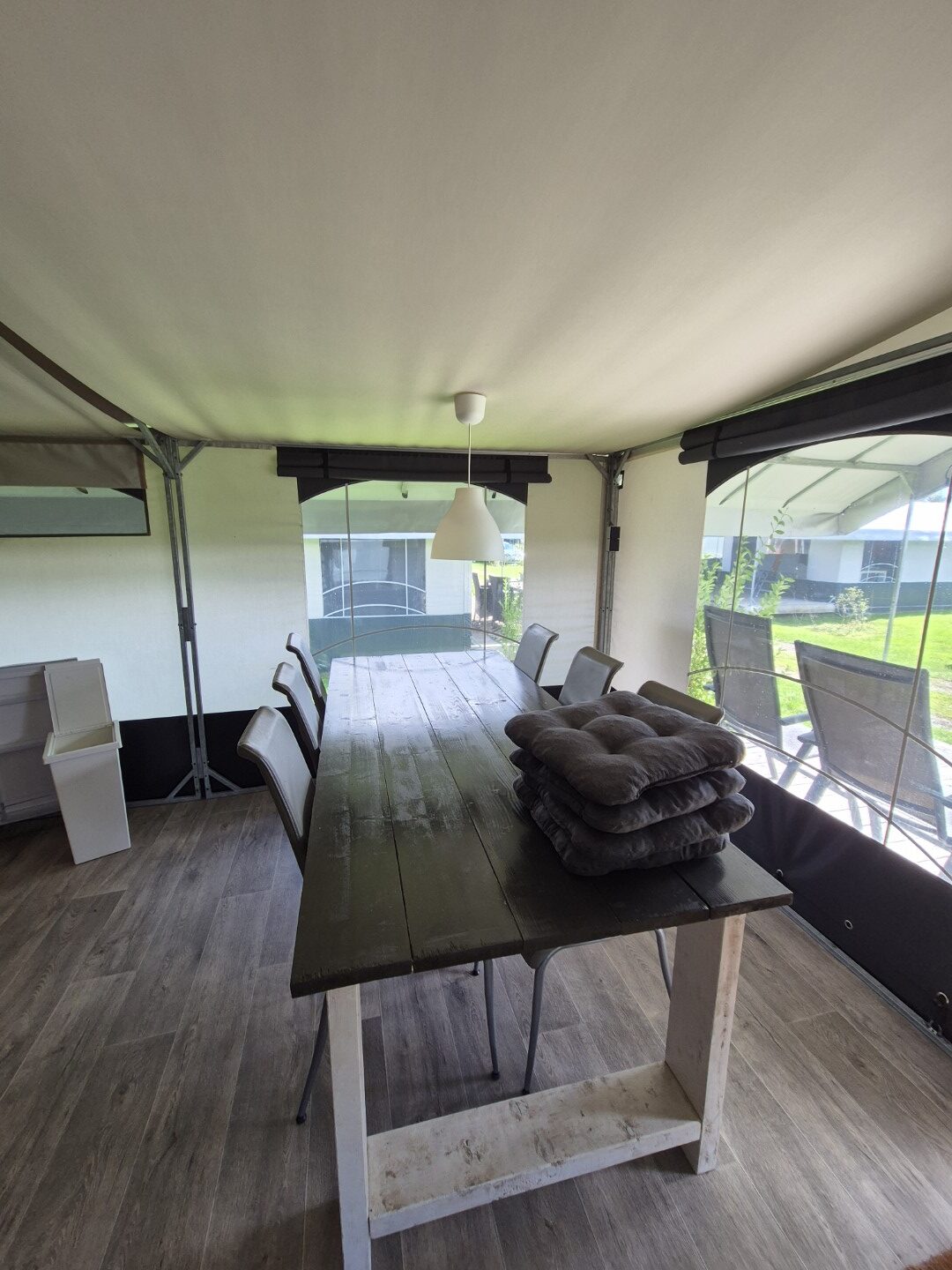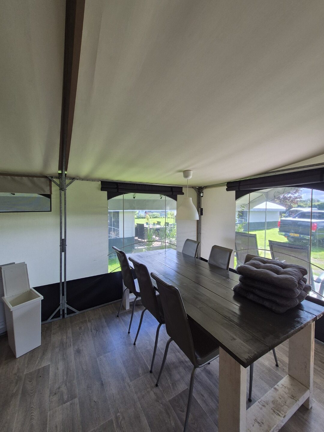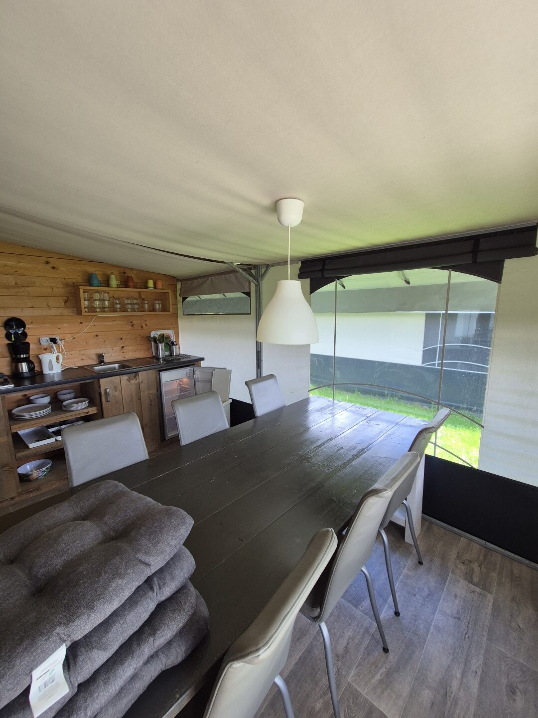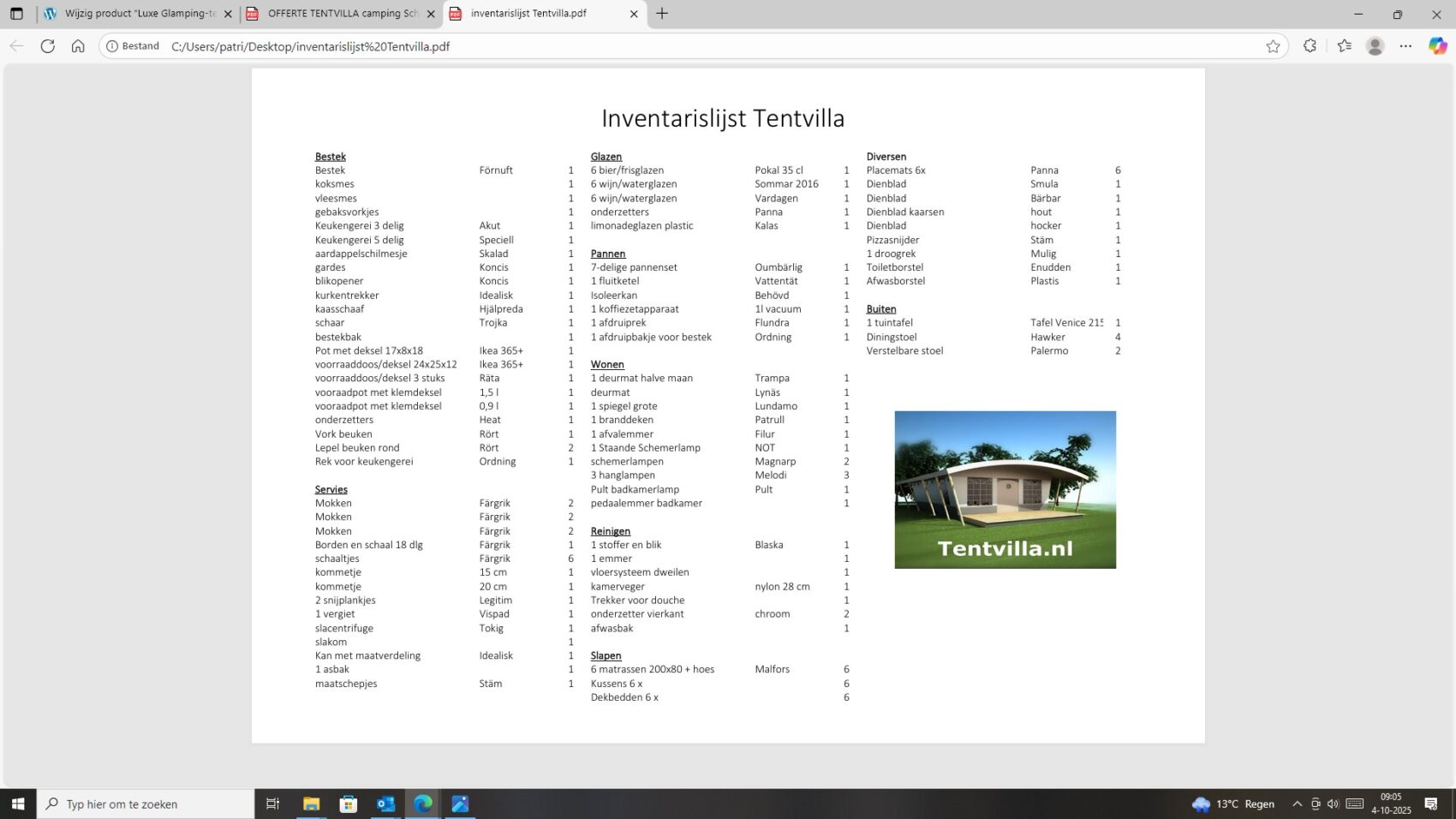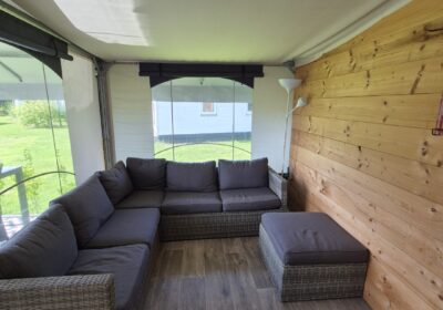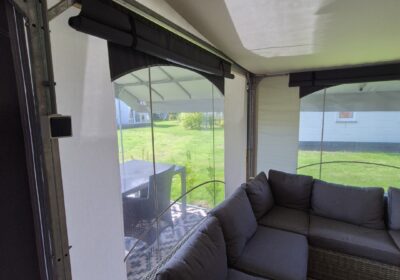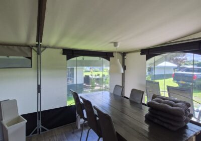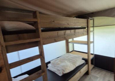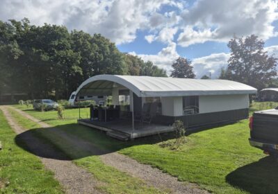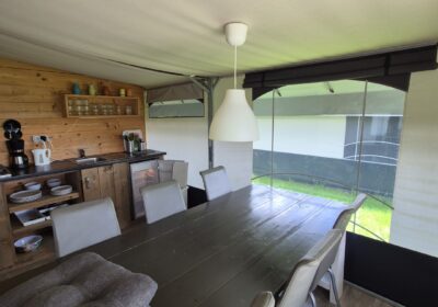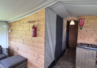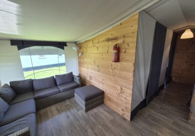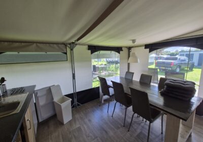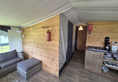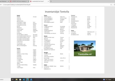 Een set van drie compleet ingerichte en nette glamping-tenten. De tenten worden geleverd met een volledige inrichting, zoals te zien op de foto’s en de bijgevoegde inventarisatielijst en bied ruimte aan zes personen met zeer uitgebreide inrichting. De badkamer heeft warm water via een elektrische boiler en de keuken is voorzien van een gasfornuis met vier pitten op propaangas. Deze verhuuraccommodaties zijn volledig uitgerust met servies, bestek en slaapbenodigdheden voor zes personen. De hoekpunten aan de voorzijde hebben wat aandacht nodig maar zijn al wel deels gerepareerd. Verder verkeren de tenten in prima staat en zijn ze nog vele jaren geschikt voor luxe verhuur. De tenten worden geleverd af locatie in Haaksbergen zelf demonteren en vervoeren en kunnen op afspraak bezichtigd worden . Prijs per stuk is € 6950,- en per 3 stuks in een koop € 19950,-