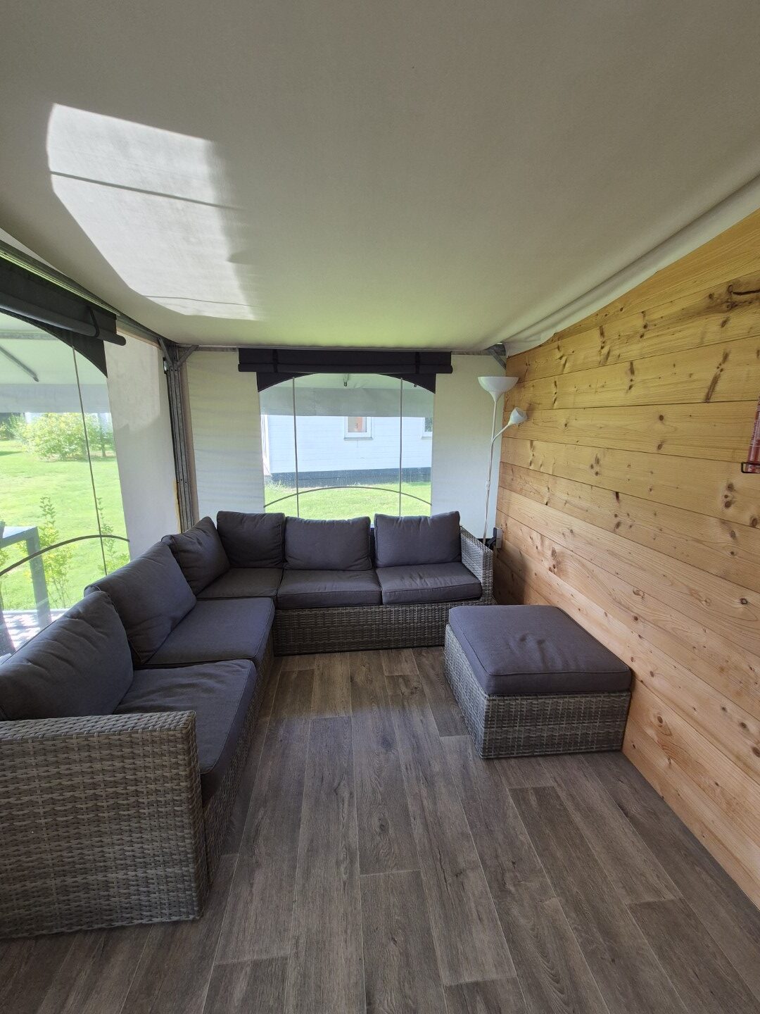 Afmeting tent ca. 742 x 600 cm + luifel van ca. 244 x 207 cm.