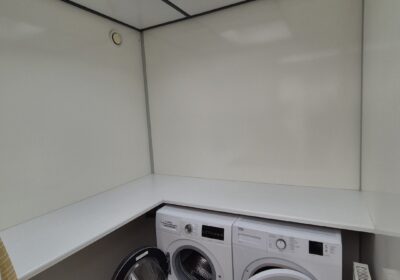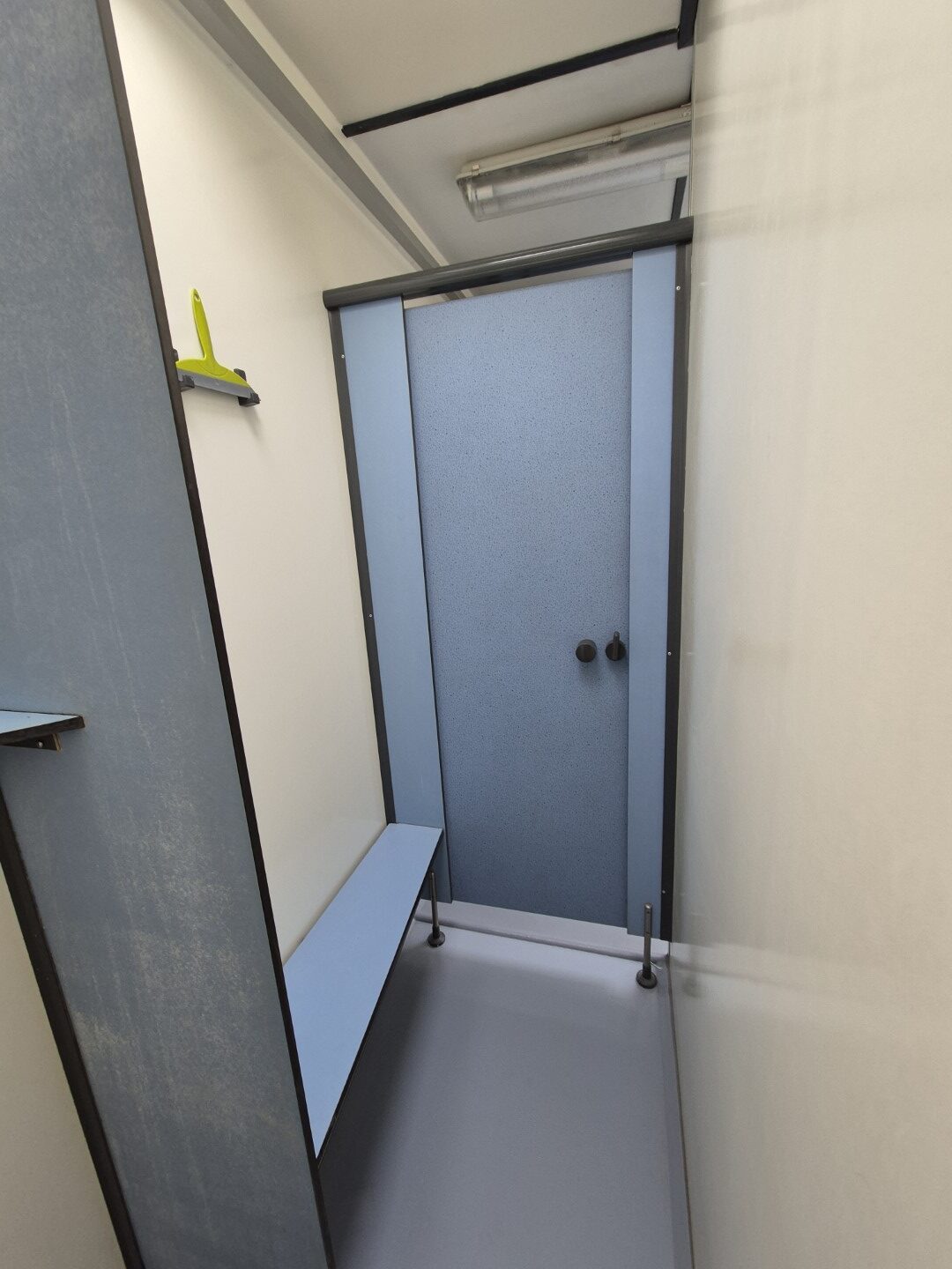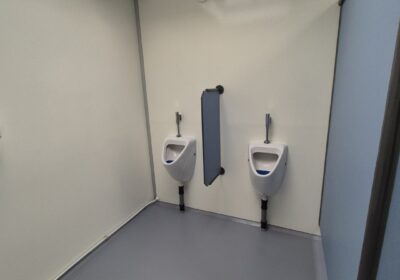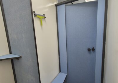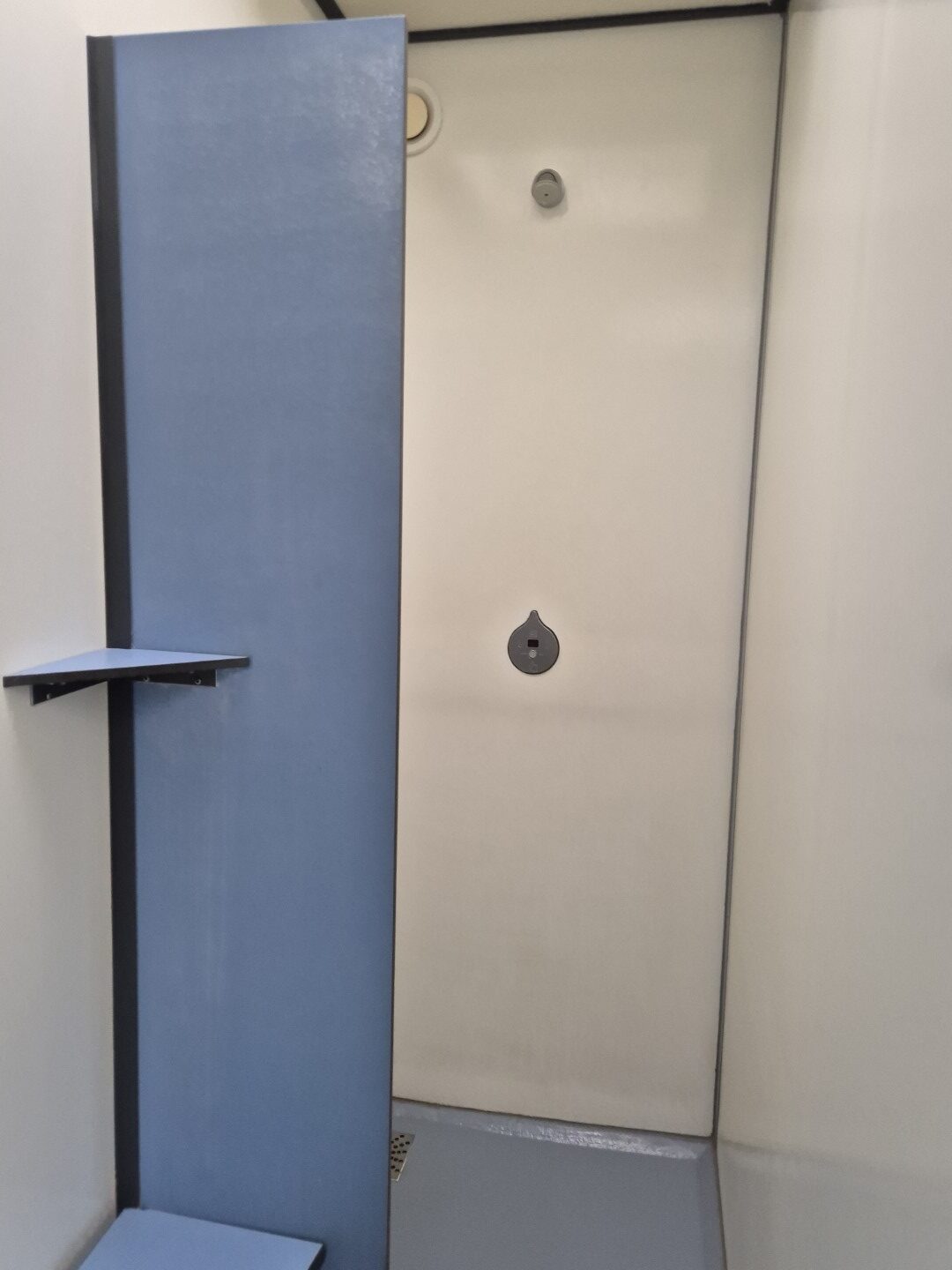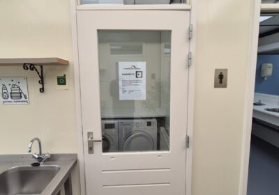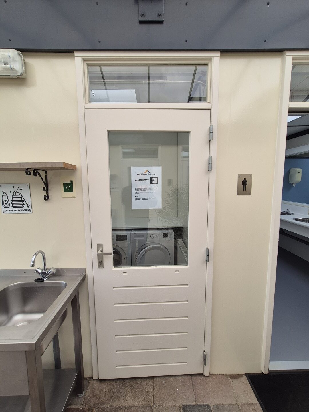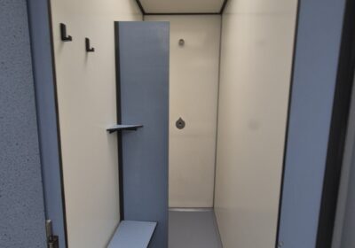 2 x urinoir , 2 x toilet cabine , handwas plaats en handen droger , 2 x ruime douche cabine , 1 x privé wascabine , en 3 tandenpoets wasplaatsen . Verder een eigen technische ruimte en een ruimte voor het plaatsen van een wasmachine en een wasdroger . Aan de buitenzijde bevind zich ook een eenvoudige afwasplaats.
