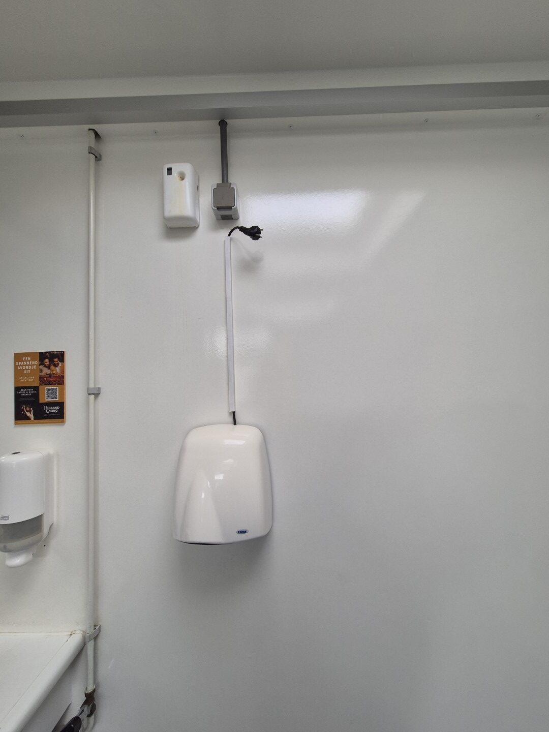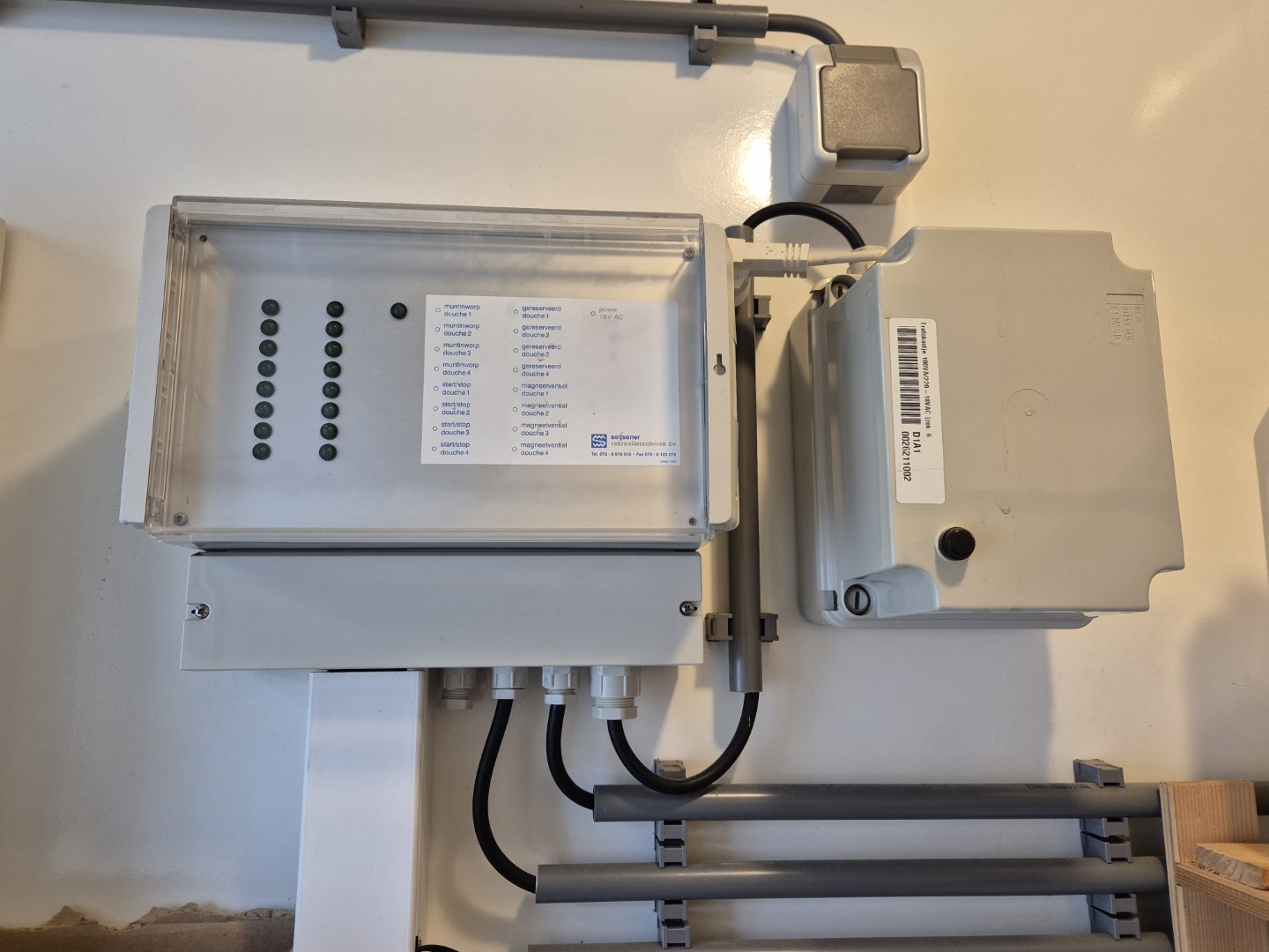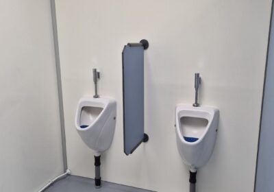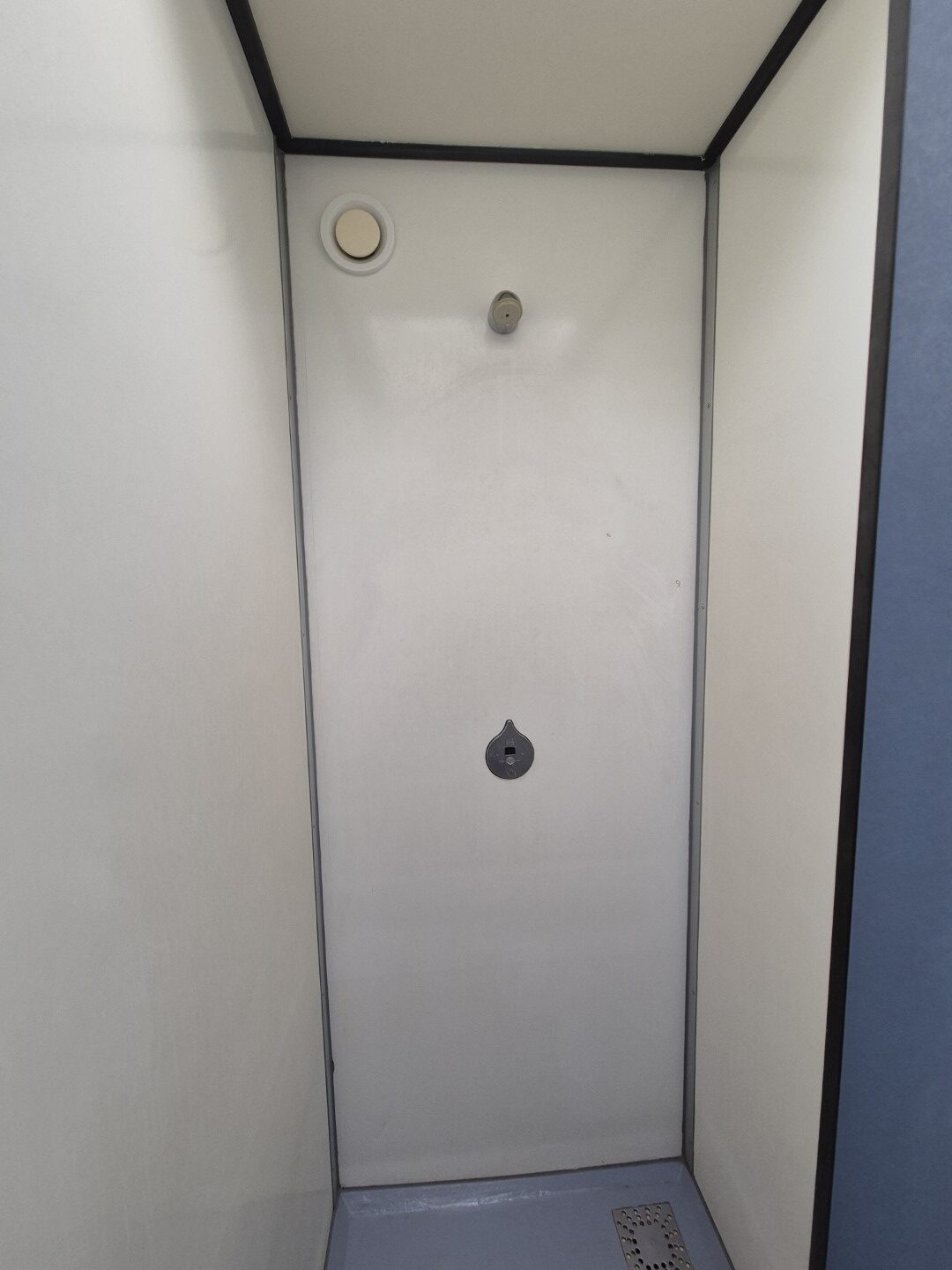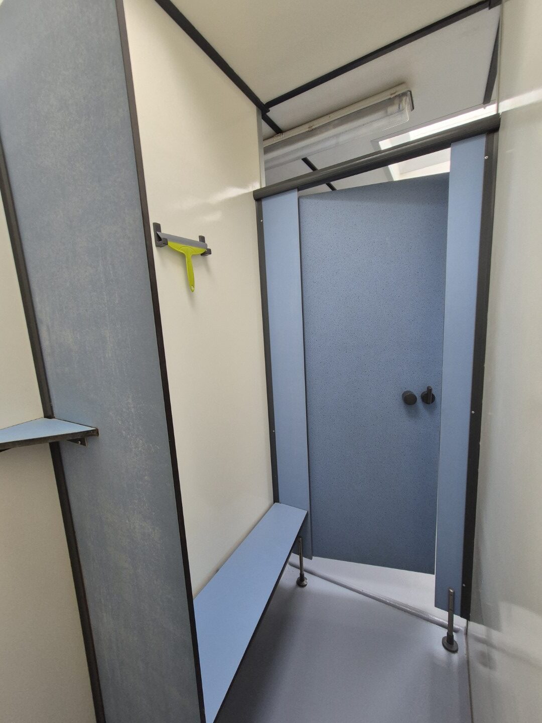 2 x urinoir , 2 x toilet cabine , handwas plaats en handen droger , 2 x ruime douche cabine , 1 x privé wascabine , en 3 tandenpoets wasplaatsen . Verder een eigen technische ruimte en een ruimte voor het plaatsen van een wasmachine en een wasdroger . Aan de buitenzijde bevind zich ook een eenvoudige afwasplaats.