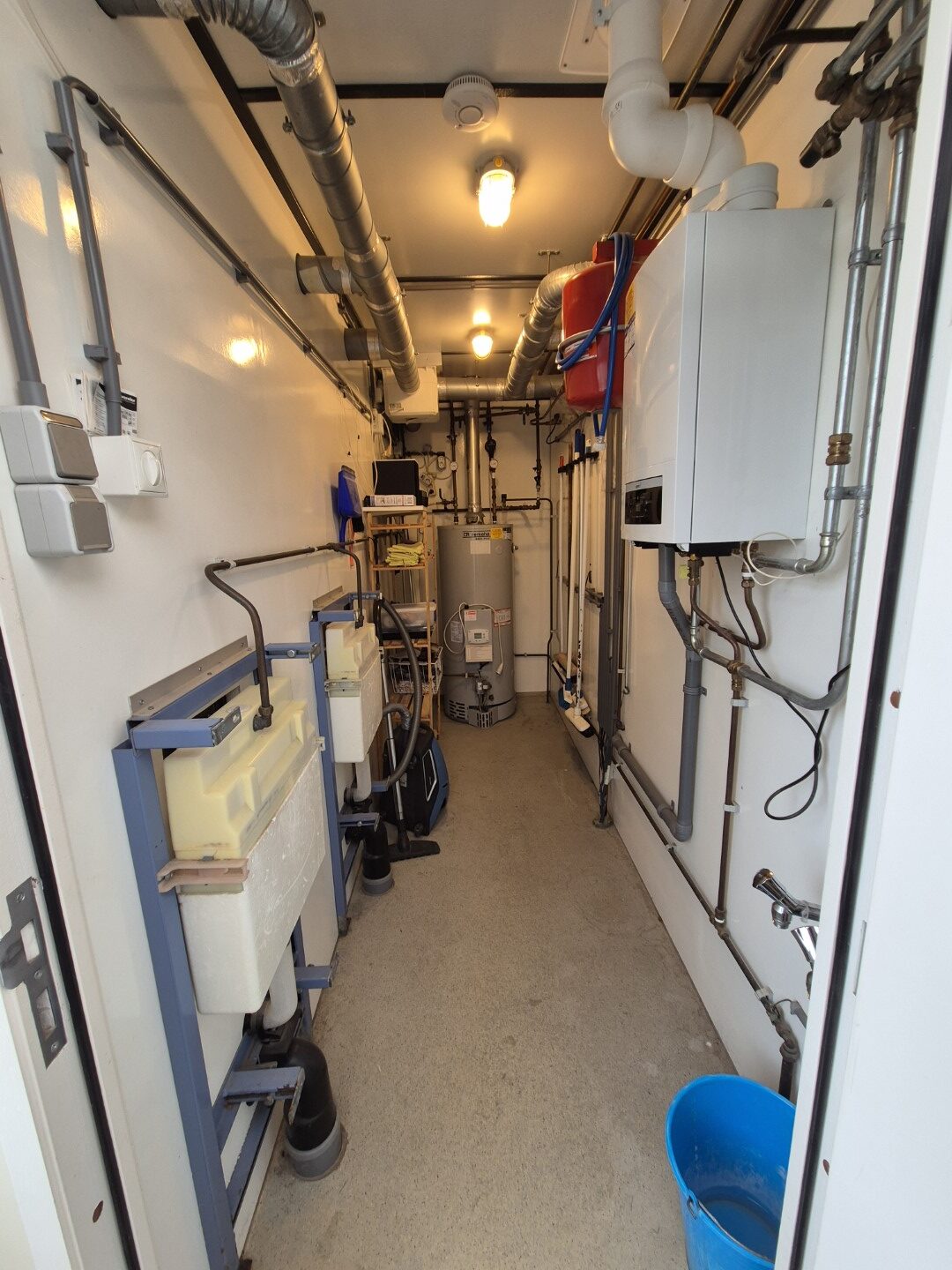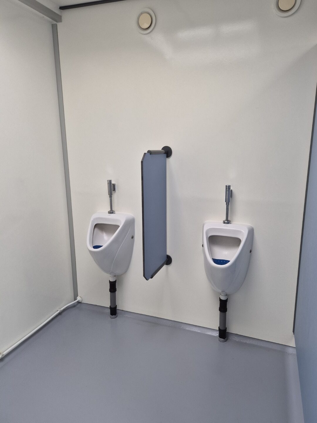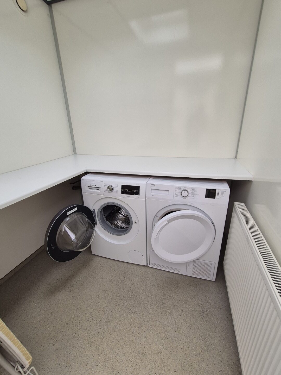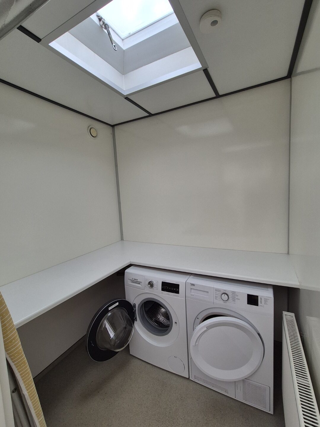 2 x urinoir , 2 x toilet cabine , handwas plaats en handen droger , 2 x ruime douche cabine , 1 x privé wascabine , en 3 tandenpoets wasplaatsen . Verder een eigen technische ruimte en een ruimte voor het plaatsen van een wasmachine en een wasdroger . Aan de buitenzijde bevind zich ook een eenvoudige afwasplaats.