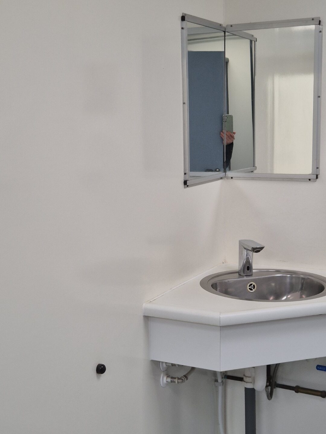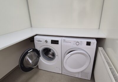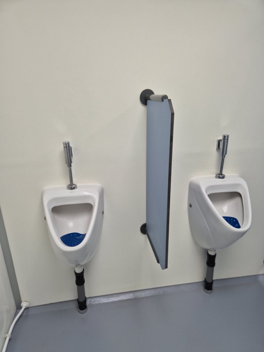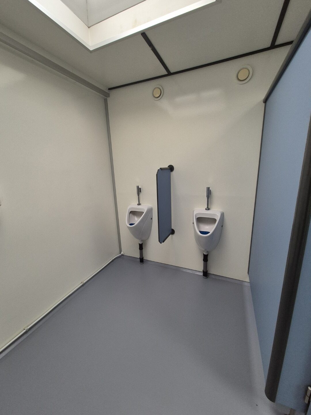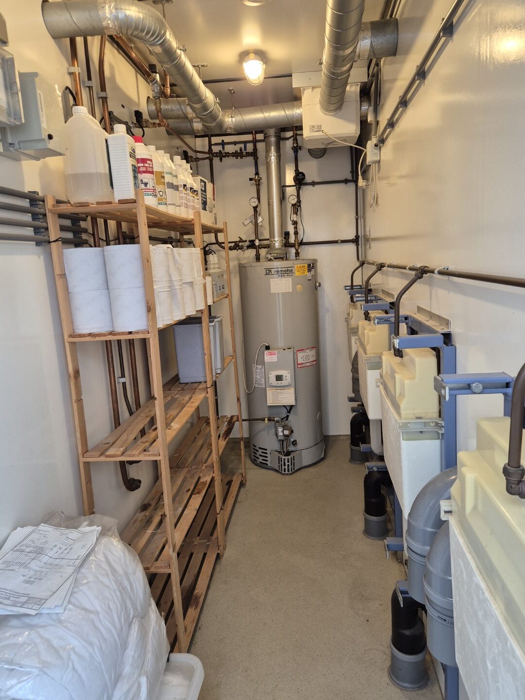 2 x urinoir , 2 x toilet cabine , handwas plaats en handen droger , 2 x ruime douche cabine , 1 x privé wascabine , en 3 tandenpoets wasplaatsen . Verder een eigen technische ruimte en een ruimte voor het plaatsen van een wasmachine en een wasdroger . Aan de buitenzijde bevind zich ook een eenvoudige afwasplaats.
