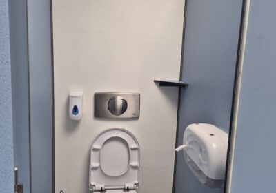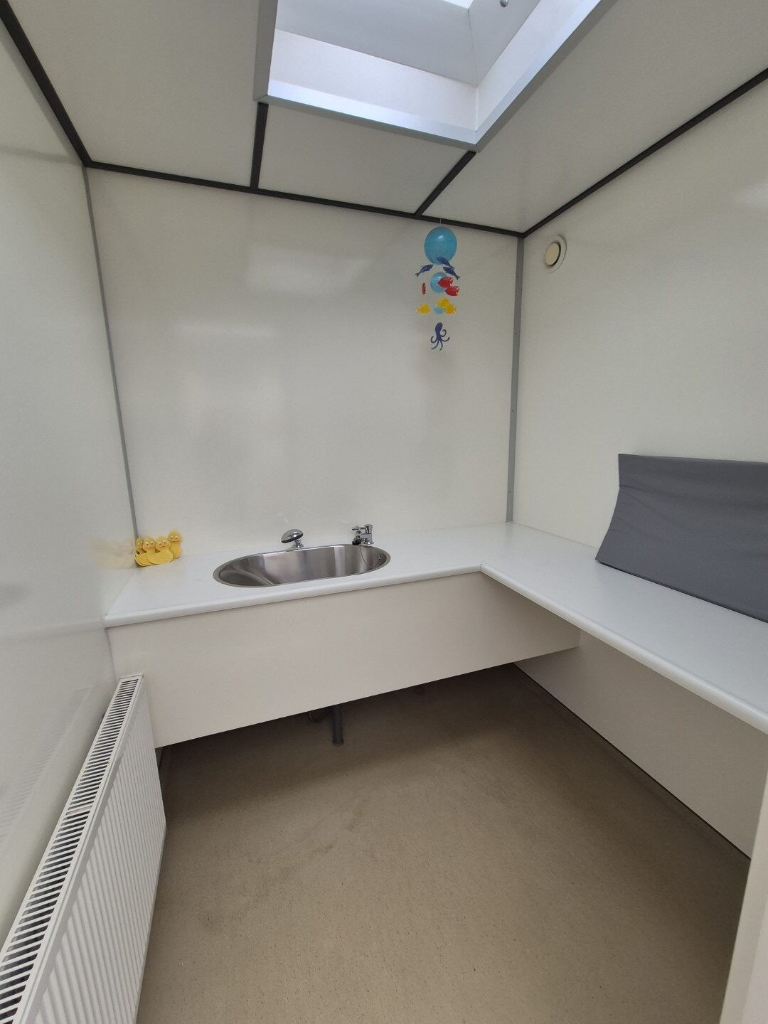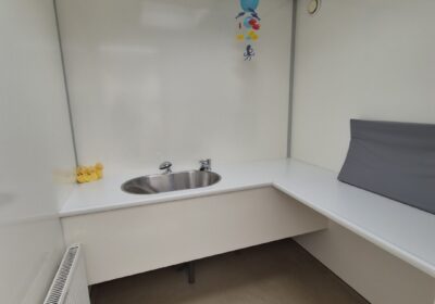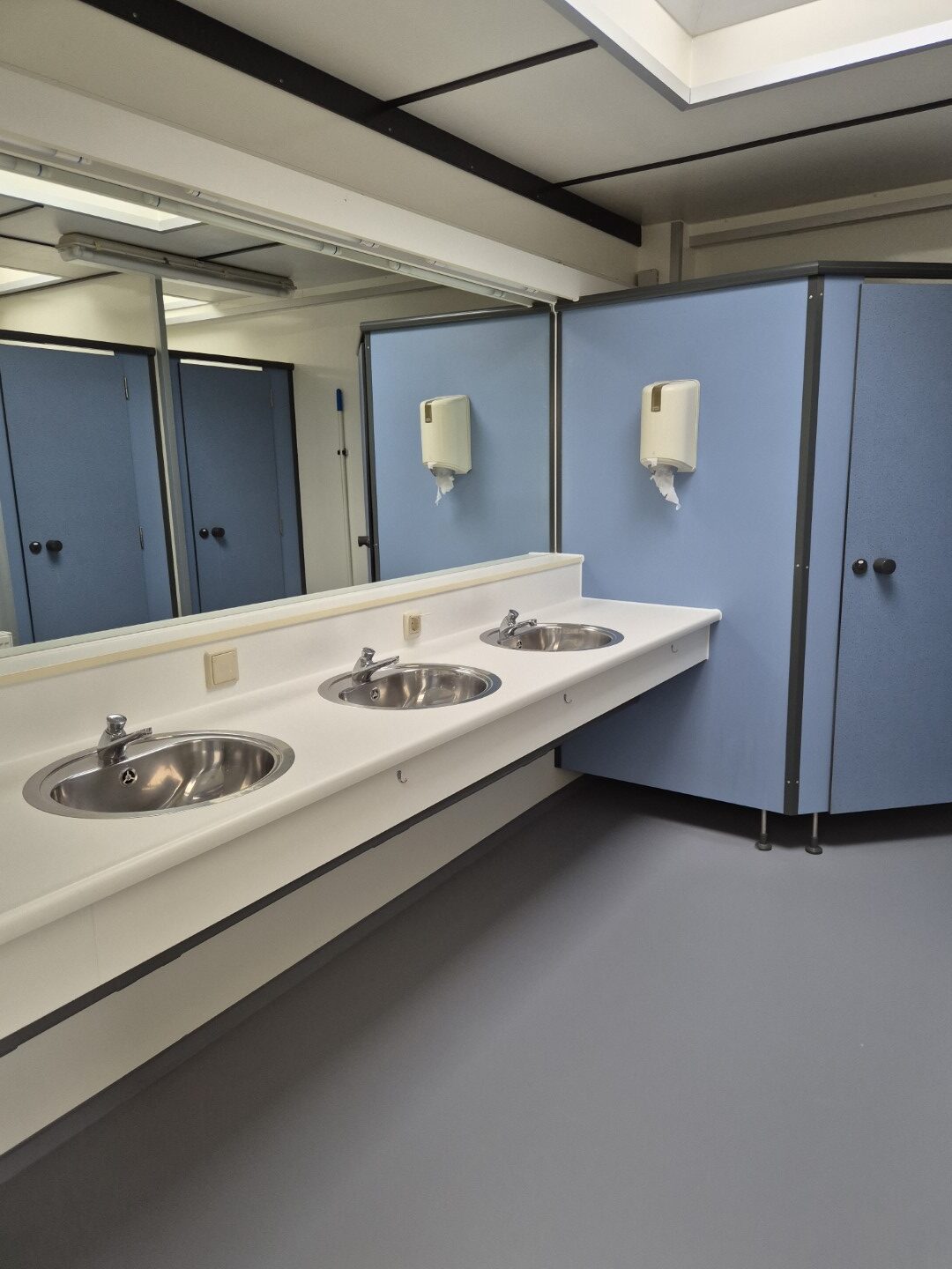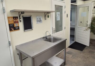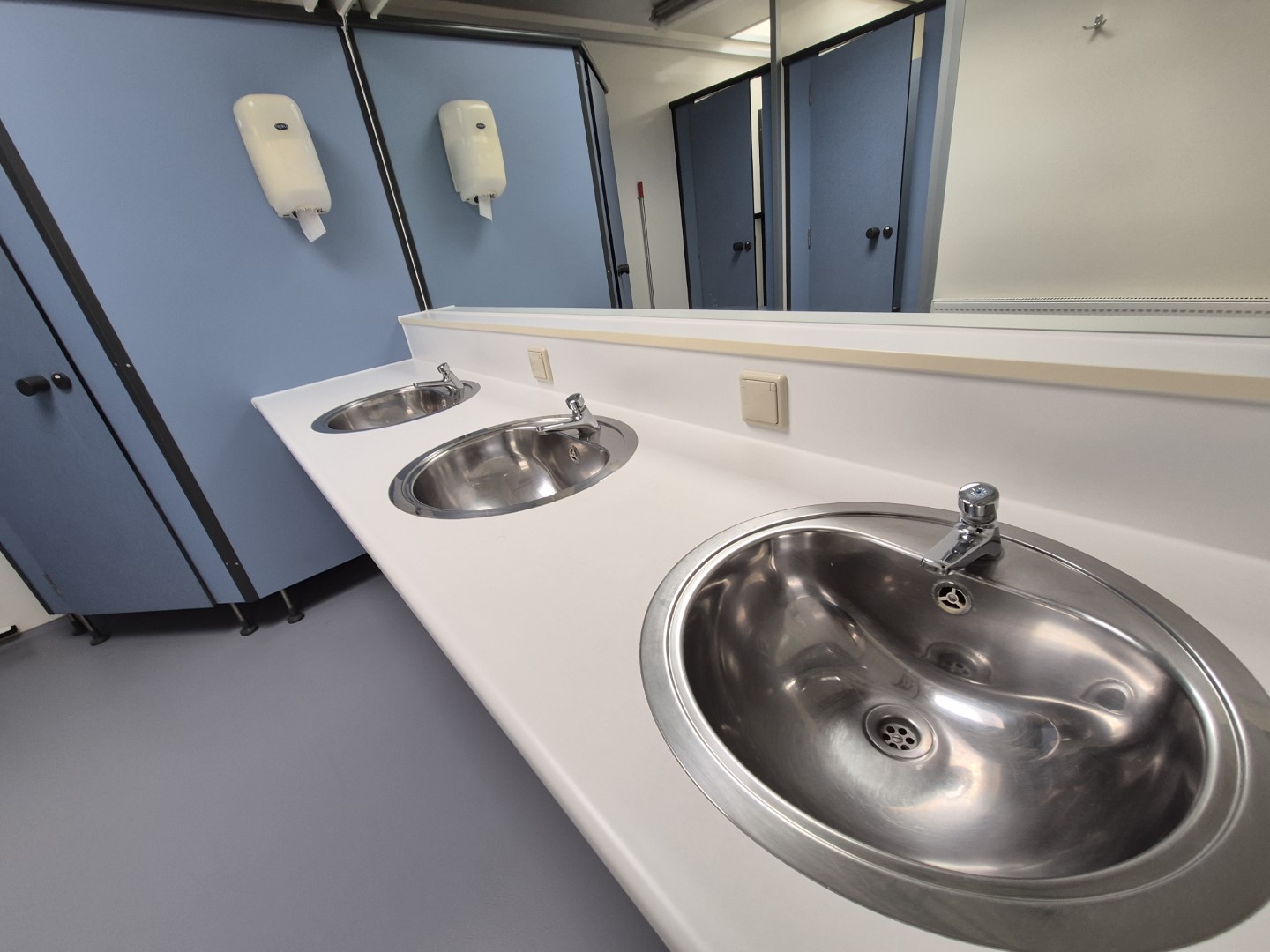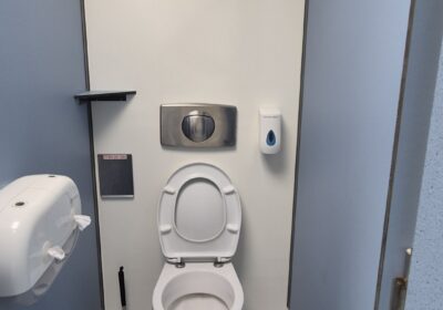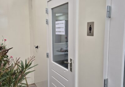 4 x toilet cabine , handwas plaats en handen droger , 2 x ruime douche cabine , 1 x babyroom met baby badje , 1 x privé wascabine , en 3 tandenpoets wasplaatsen . Verder een eigen technische ruimte en aan de buitenkant een eenvoudige afwasplaats.