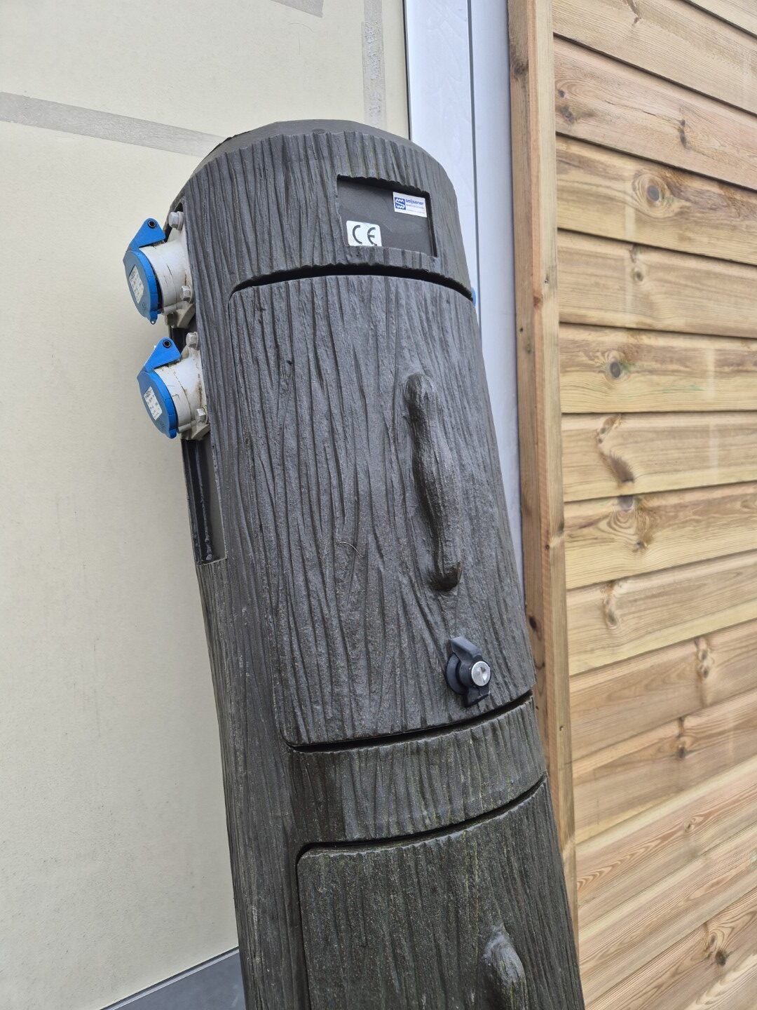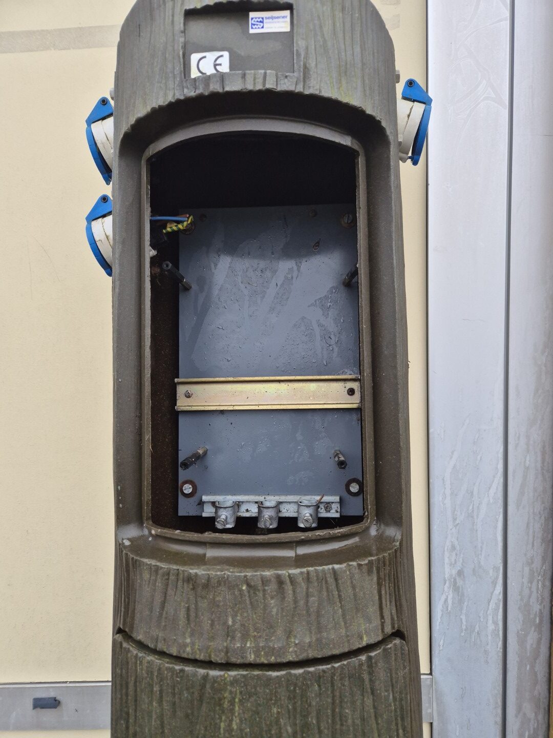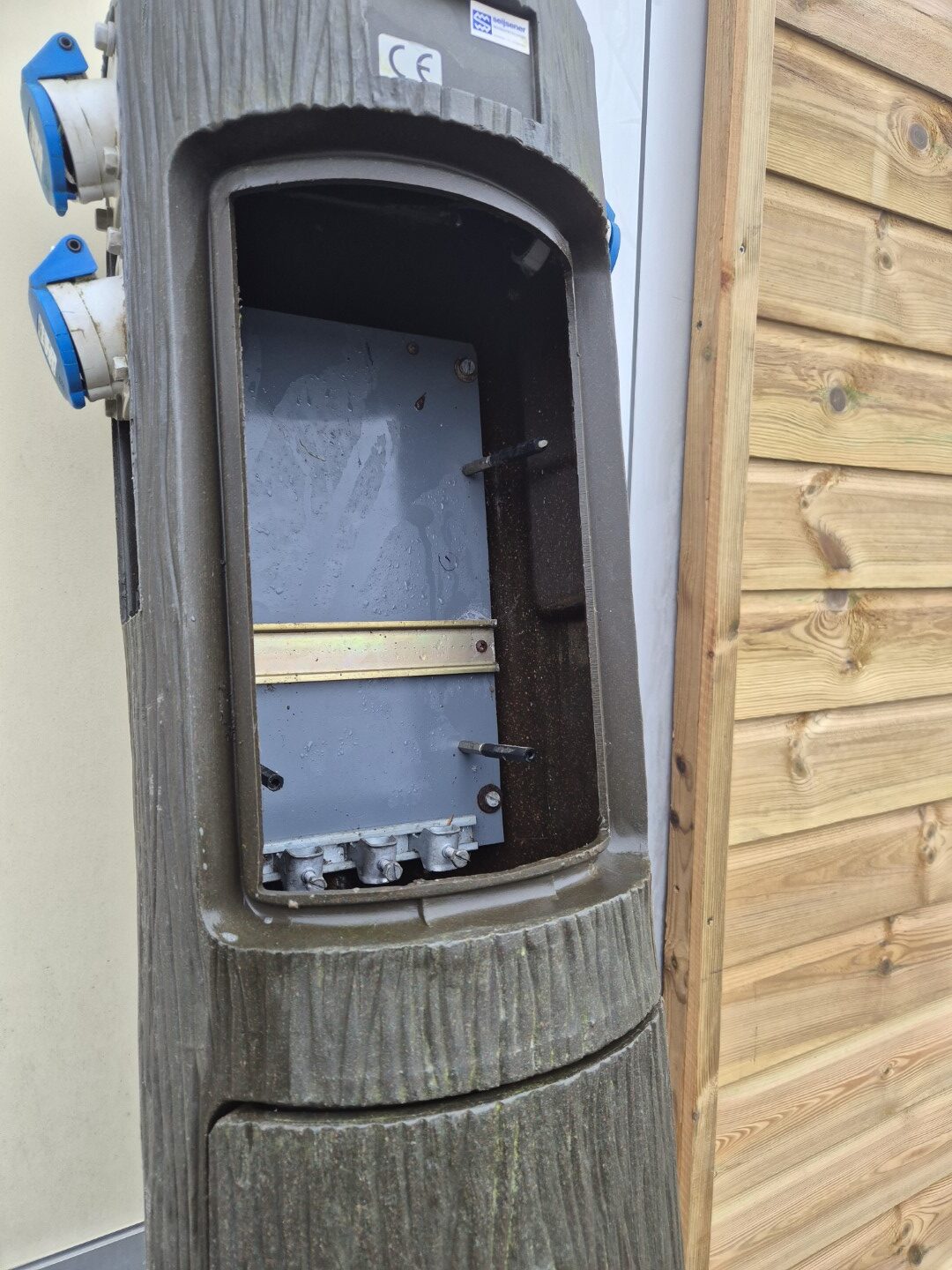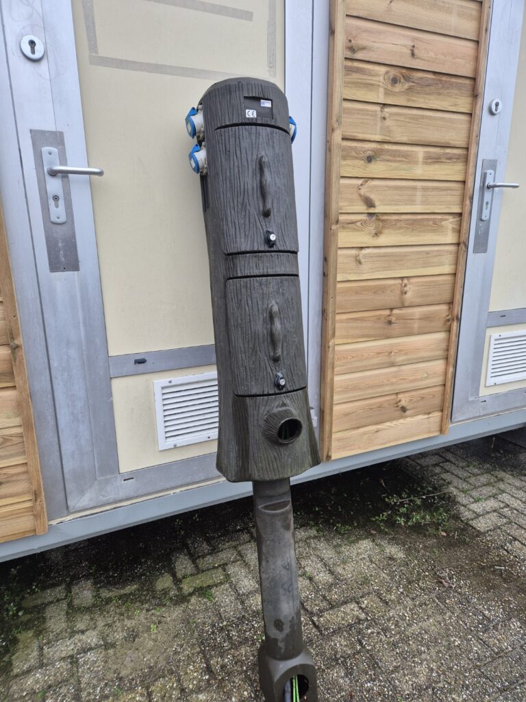 Een gebruikte Seijsener en afsluitbare boomstam met 3 x euro stekker aansluiting ( uit te breiden naar max. 6x euro aansluitingen) en water aansluiting op de achterzijde. Zeer makkelijke plaatsing en doorvoer van kabels en leidingen met veel ruimte in de kast voor de invulling . Prijs 255,-  eventueel zijn er naar keuze ook een speciaal water vast kastje leverbaar voor plaatsing in 6 en 12 modules groot en zijn ook alle elektra componenten leverbaar in voordelige prijzen ( 6 , 10 of 16 Ampère zekering/ aardlek etc. ) Ook zijn er special kunststof afvoerputten van Seijsener erbij te leveren voor 60,- per stuk compleet. Deze servicepaal past daar precies in.