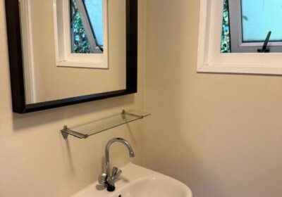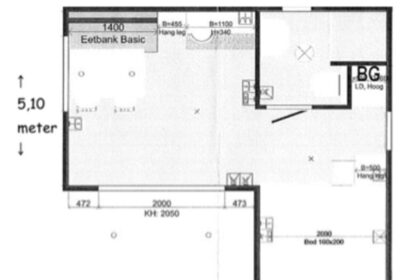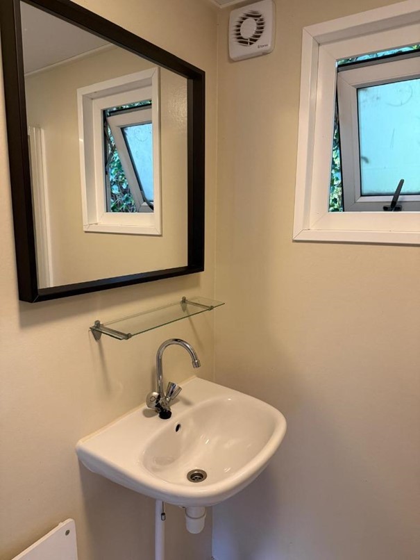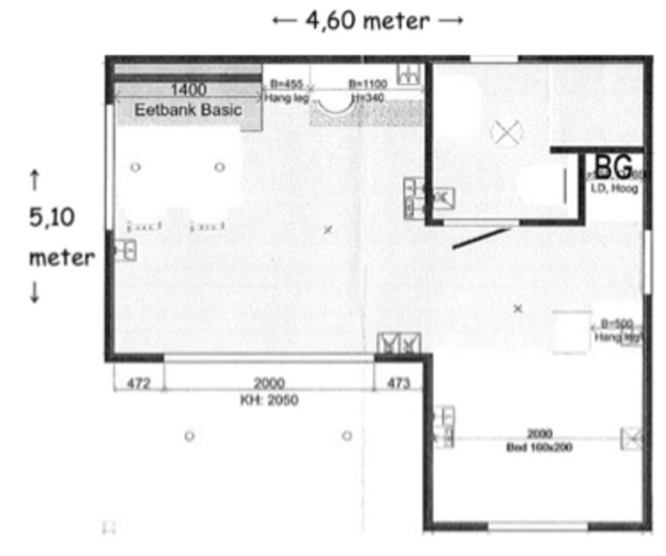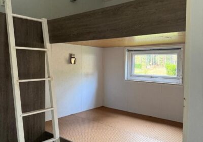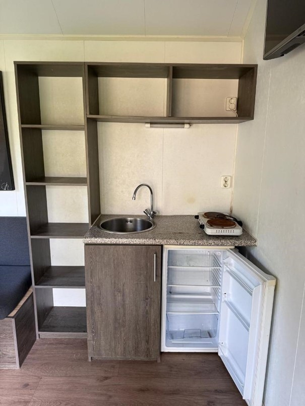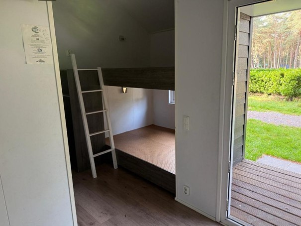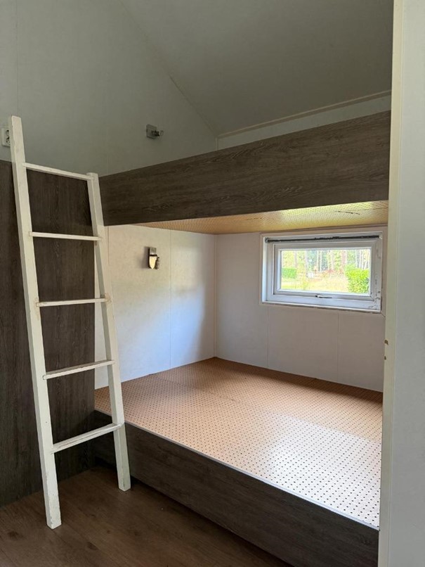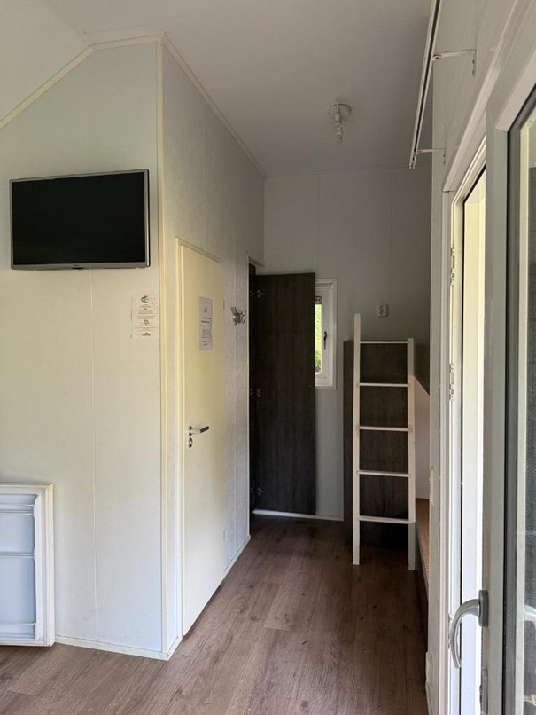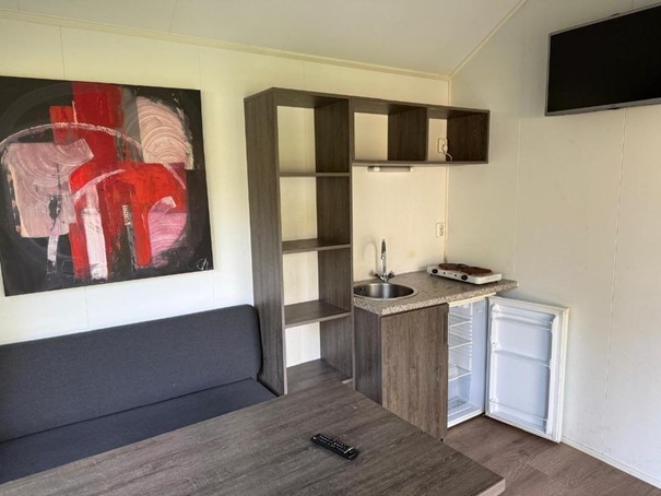 De living, keuken en slaapkamer bevinden zich in 1 ruimte. De keuken bestaat uit een recht keukenblok met koelkast, 2-pits om te koken. Het slaapgedeelte bestaat uit een tweepersoonsbed aan de onderzijde en een tweepersoonsbed aan de bovenzijde (afmeting: 1,60 x 2,00 meter). Aan de bovenzijde bij het tweepersoonsbed hangt nog een TV en er is ook een kast aanwezig. In de living staat een elektrische kachel. De badkamer bestaat uit een wastafel met spiegel, toilet, douche en elektrische verwarming. Het chalet is voorzien van rolgordijnen, verlichting en stopcontacten.