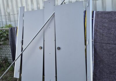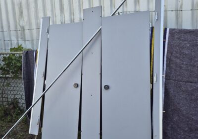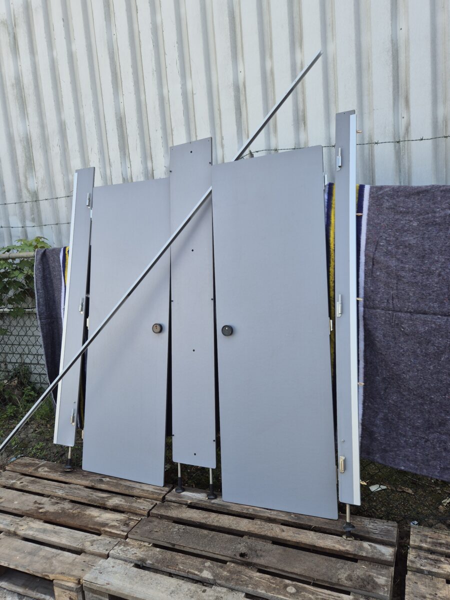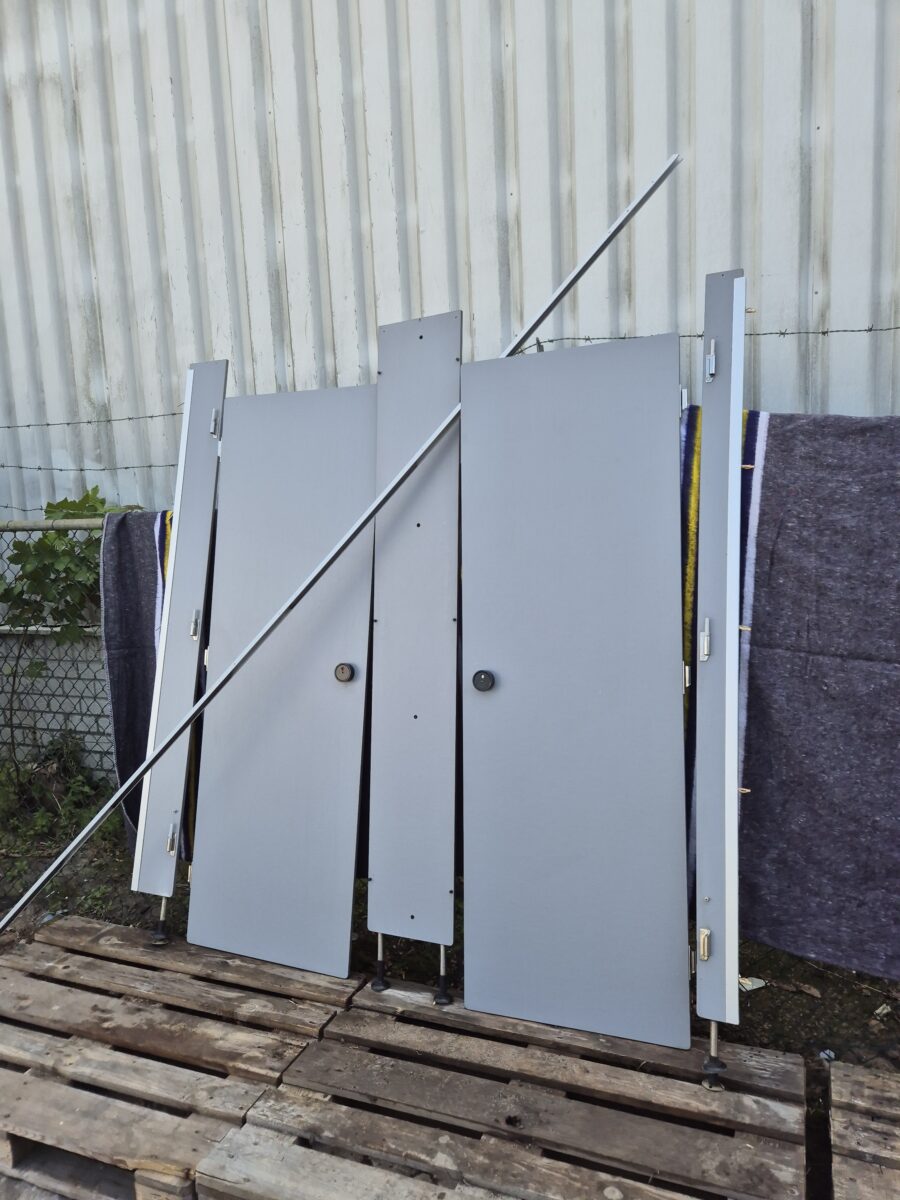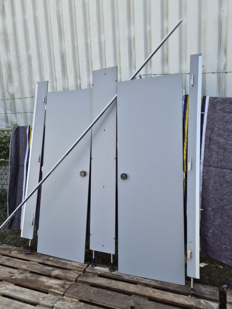 Een gebruikte set van 2 sanitair cabines in volkern trespa en hufterproof . Nette set van 2 cabines in de kleur grijs compleet met een diepe tussenwand. Dit systeem op pootjes is makkelijke te installeren en is onderhoudsvrij . Maatvoering 180 cm frontbreedte en een diepte van 130 cm tussenwand. Prijs 195,-